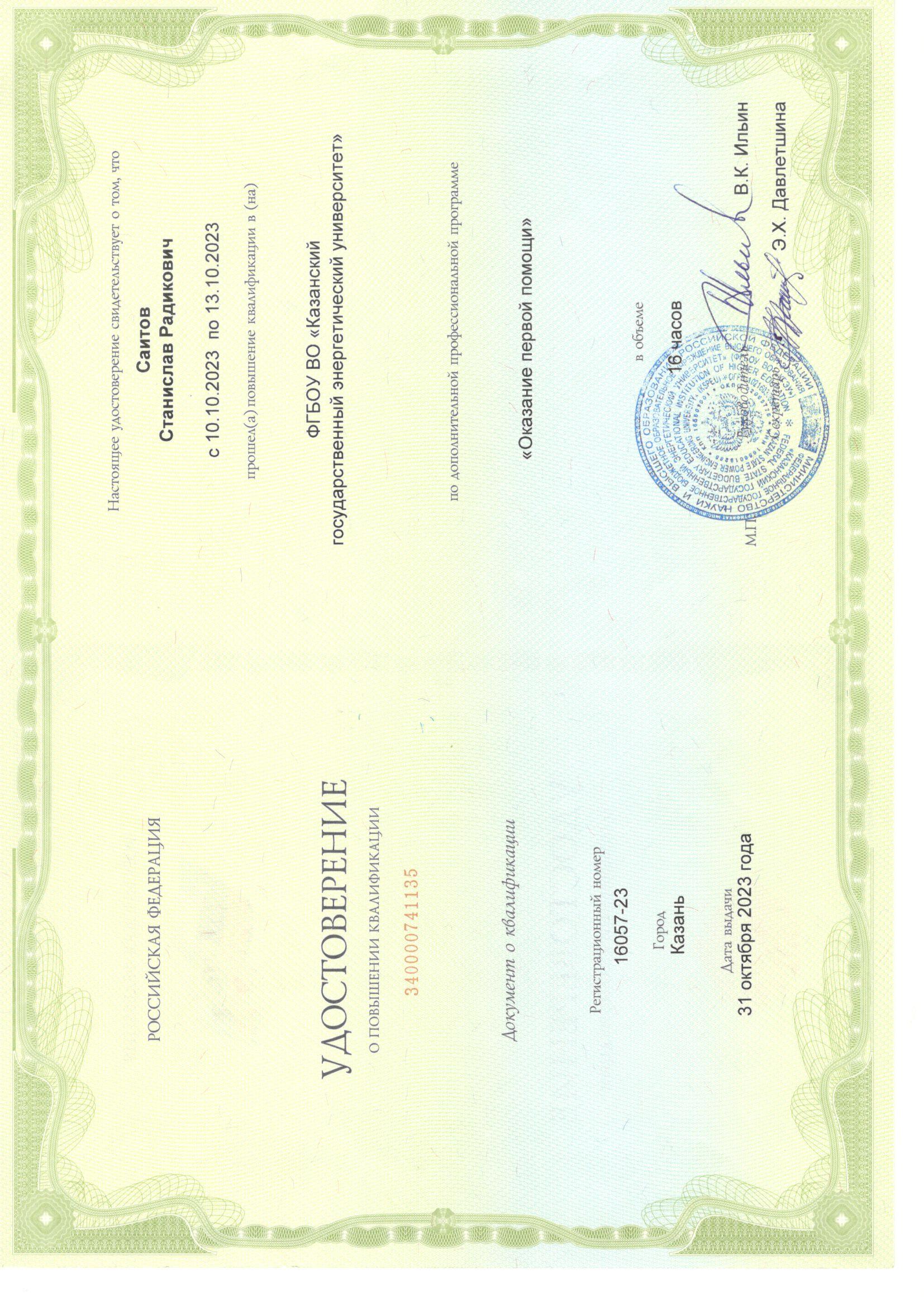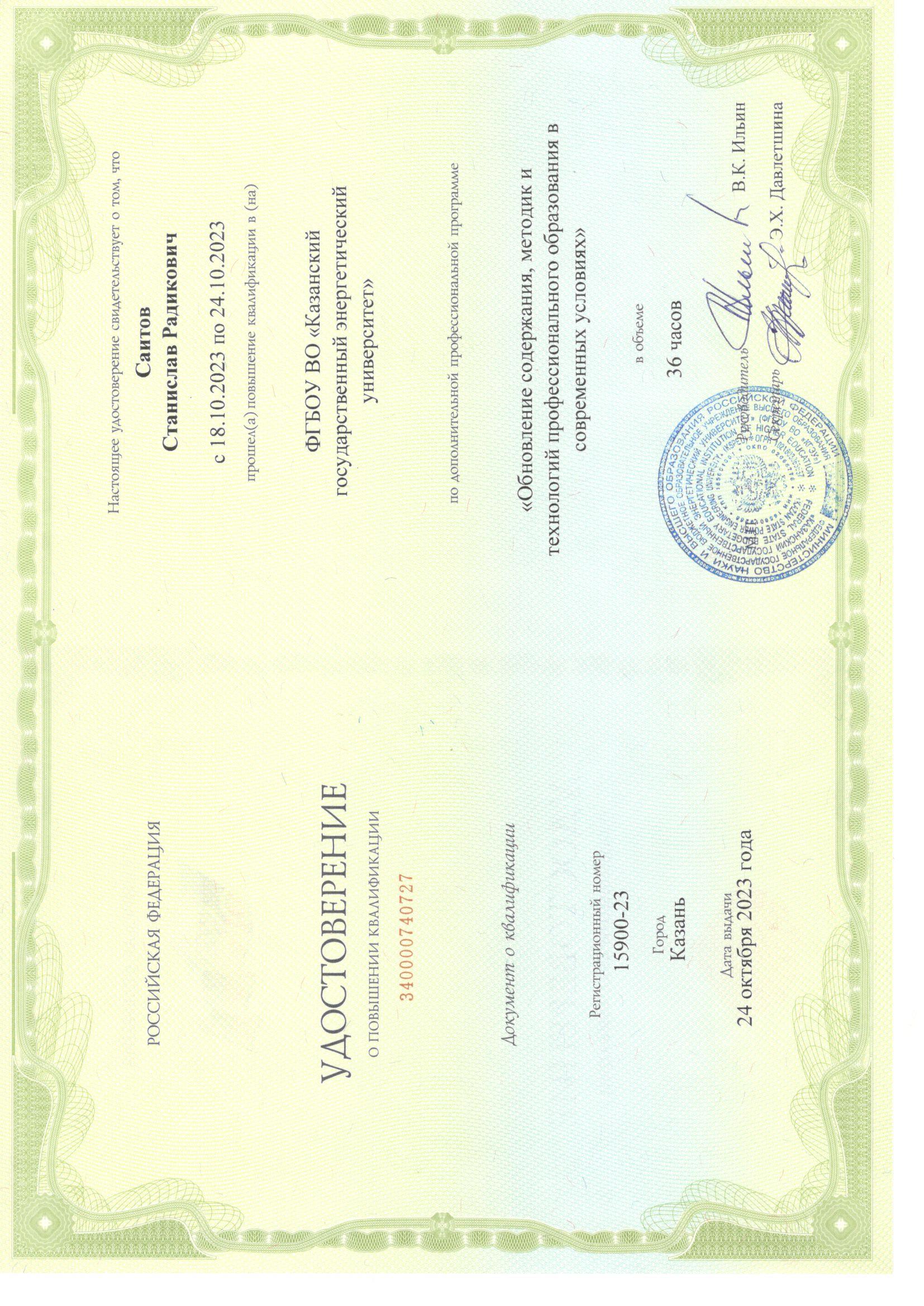 Повышение квалификации по дополнительной профессиональной программе «Обновление содержания, методик и технологий профессионального образования в современных условиях», 24.10.2023, №340000740727, 36 ч. |