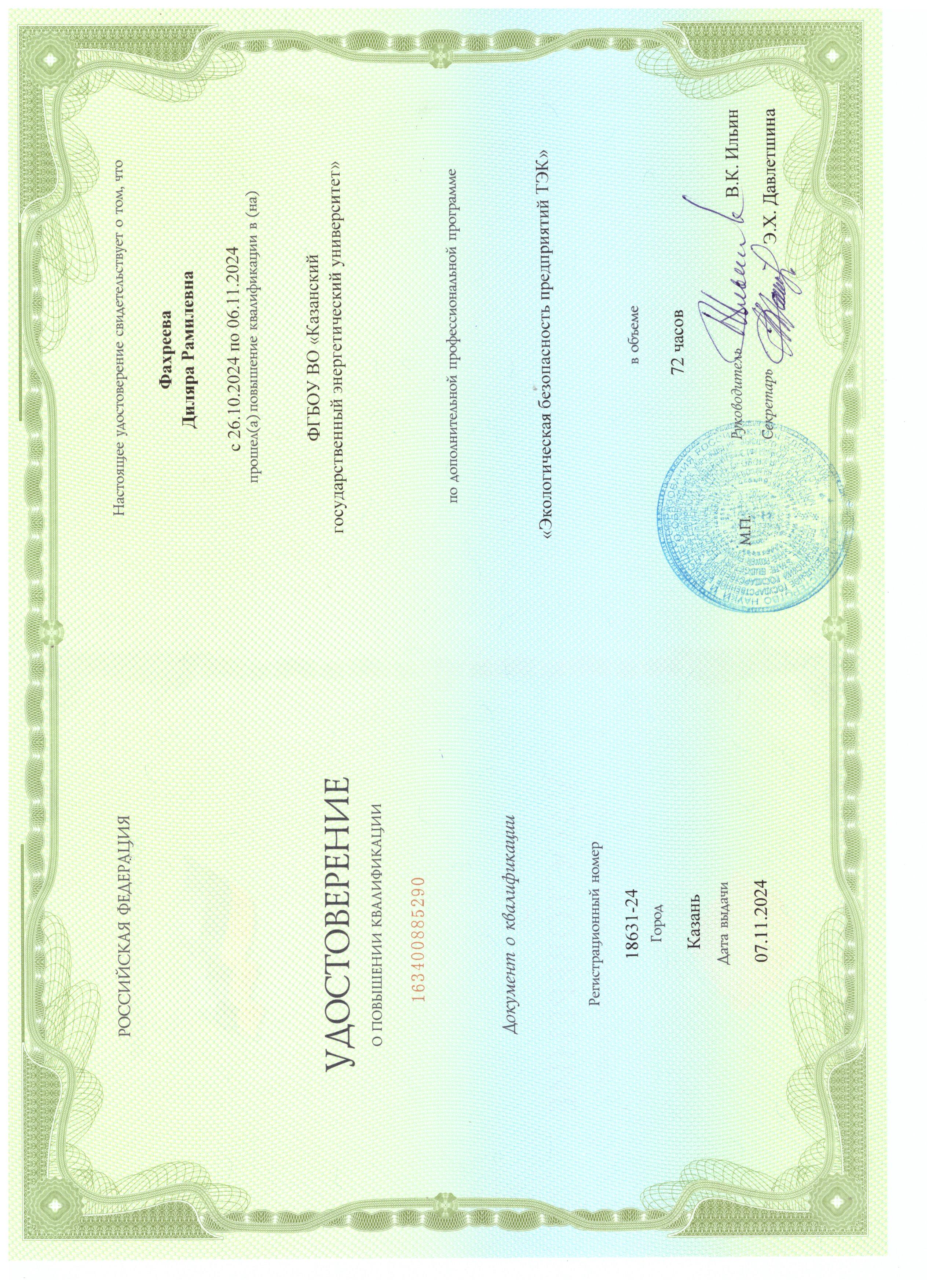 ФГБОУ ВО "Казанский государственный энергетический университет" Экологическая безопасность предприятий ТЭК 163400885290 07.11.2024 72