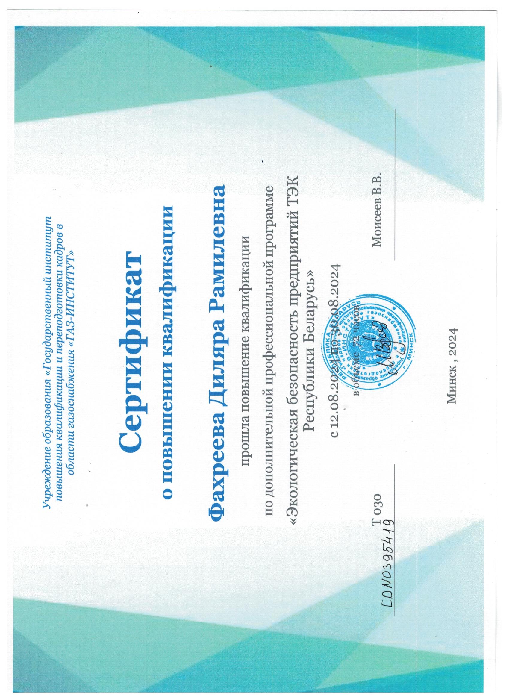 Учреждение образования "Государственный институт повышения квалификации и переподготовки кадров в области газоснабжения "ГАЗ-ИНСТИТУТ" Экологическая безопасность предприятий ТЭК Республики Беларусь" 0395419 30.08.2024 72
