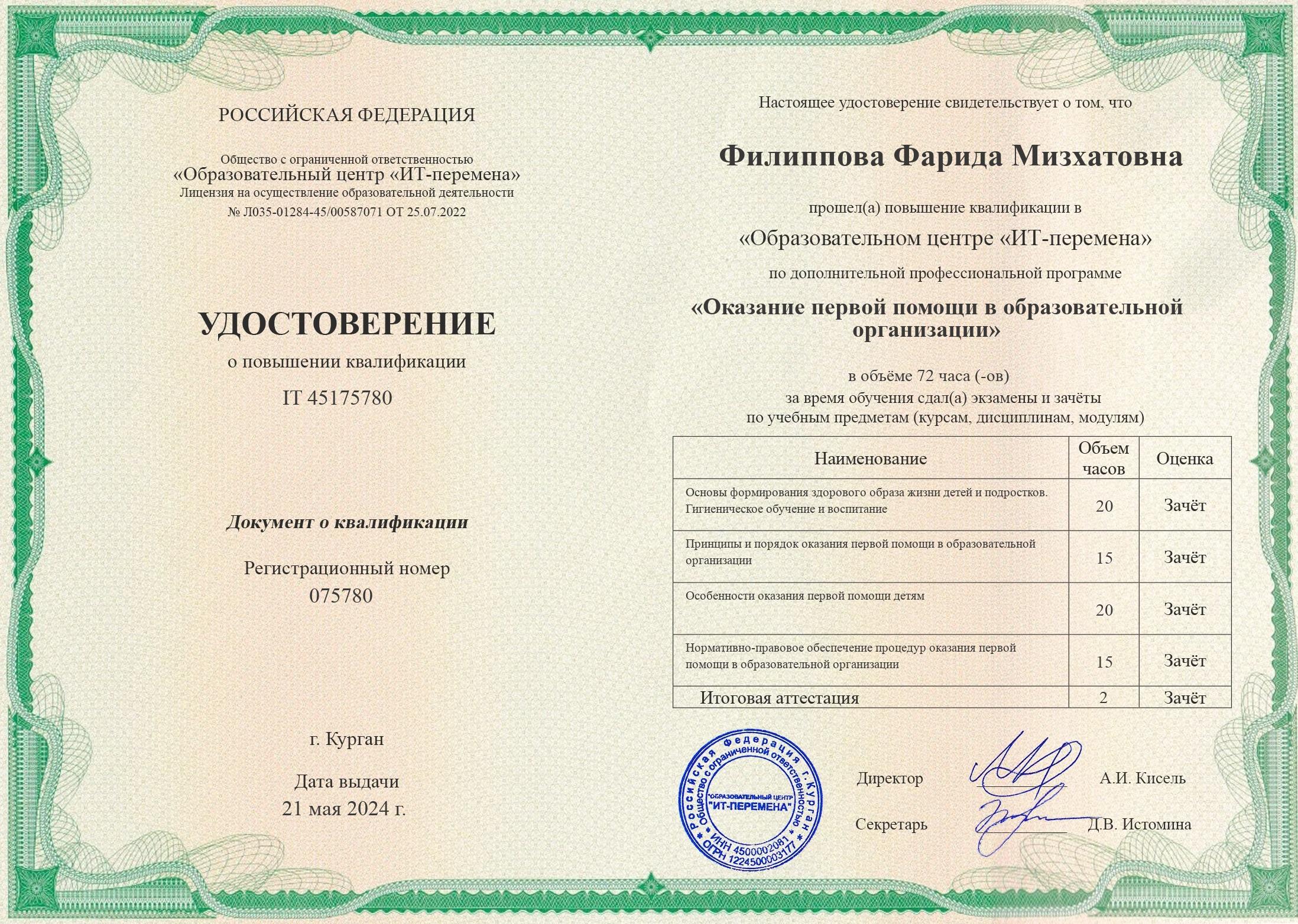 Образовательный центр "ИТ-перемена", г. Курган "Оказание первой помощи в образовательной организации" 075780 21.05.2024 72