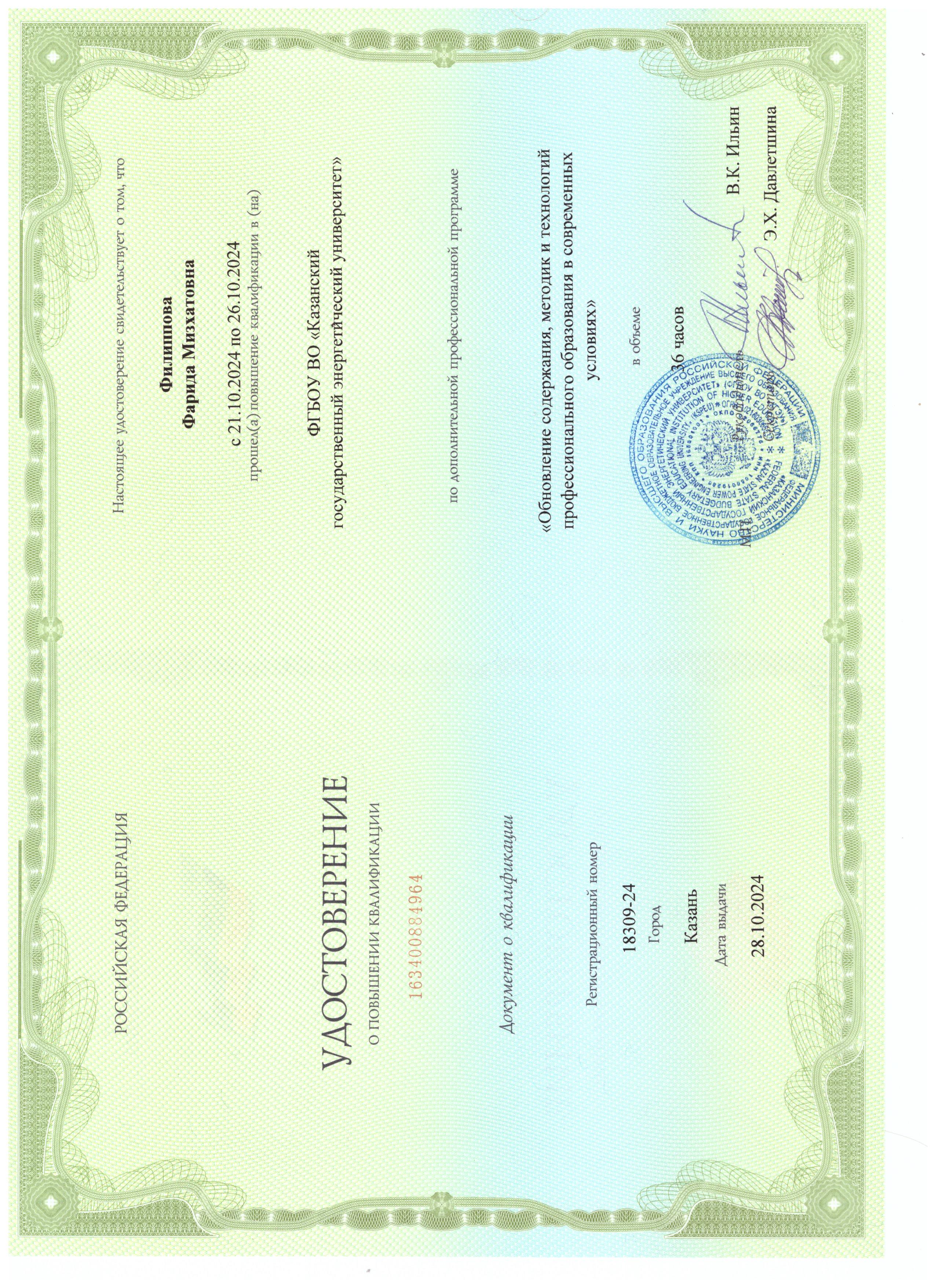 ФГБОУ ВО "КГЭУ" "Обновление содержания, методик и технологий профессионального образования в современных условиях" 163400884964 28.10.2024 36