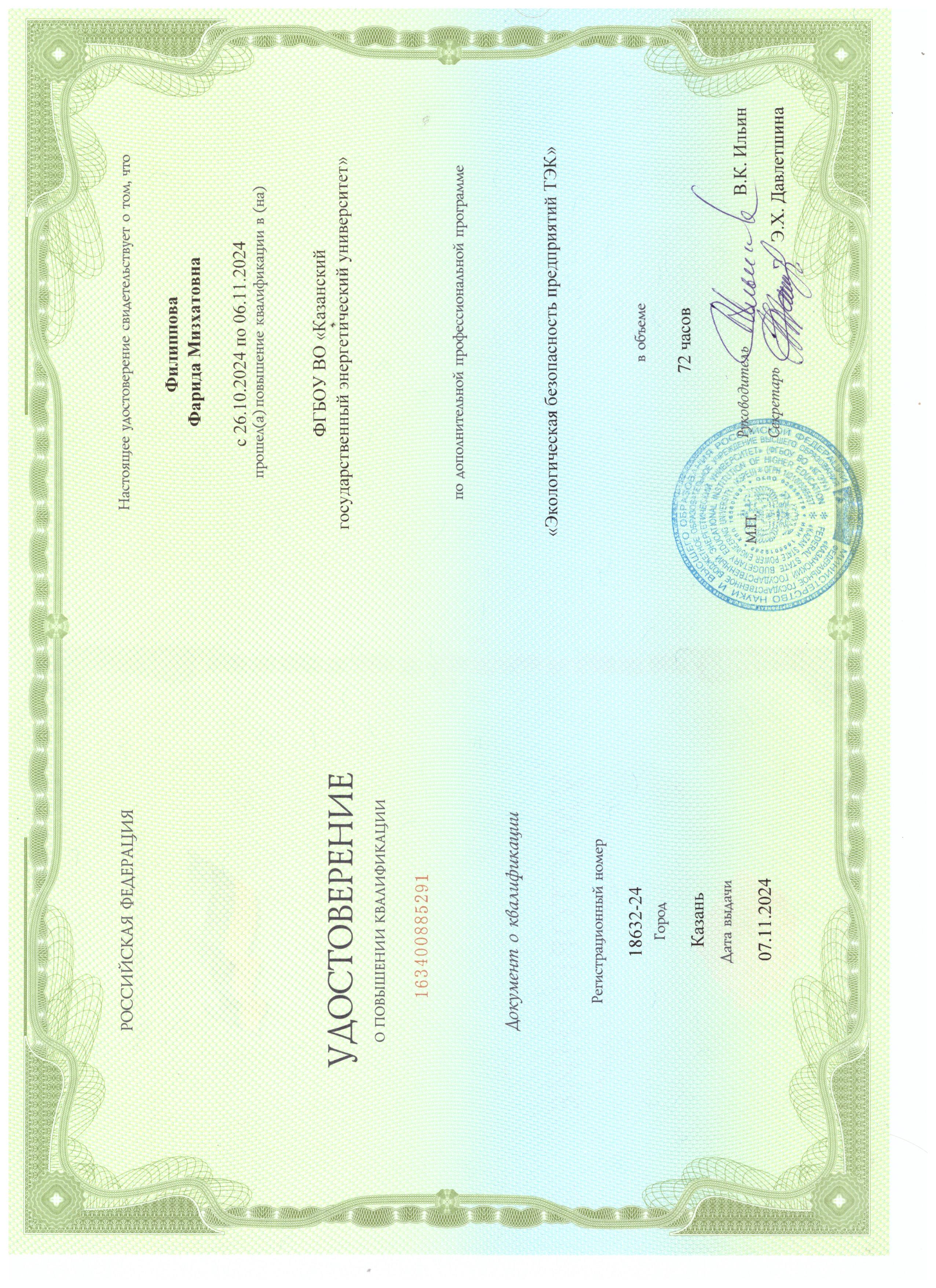 ФГБОУ ВО "КГЭУ" "Экологическая безопасность предприятий ТЭК" 163400885291 07.11.2024 72