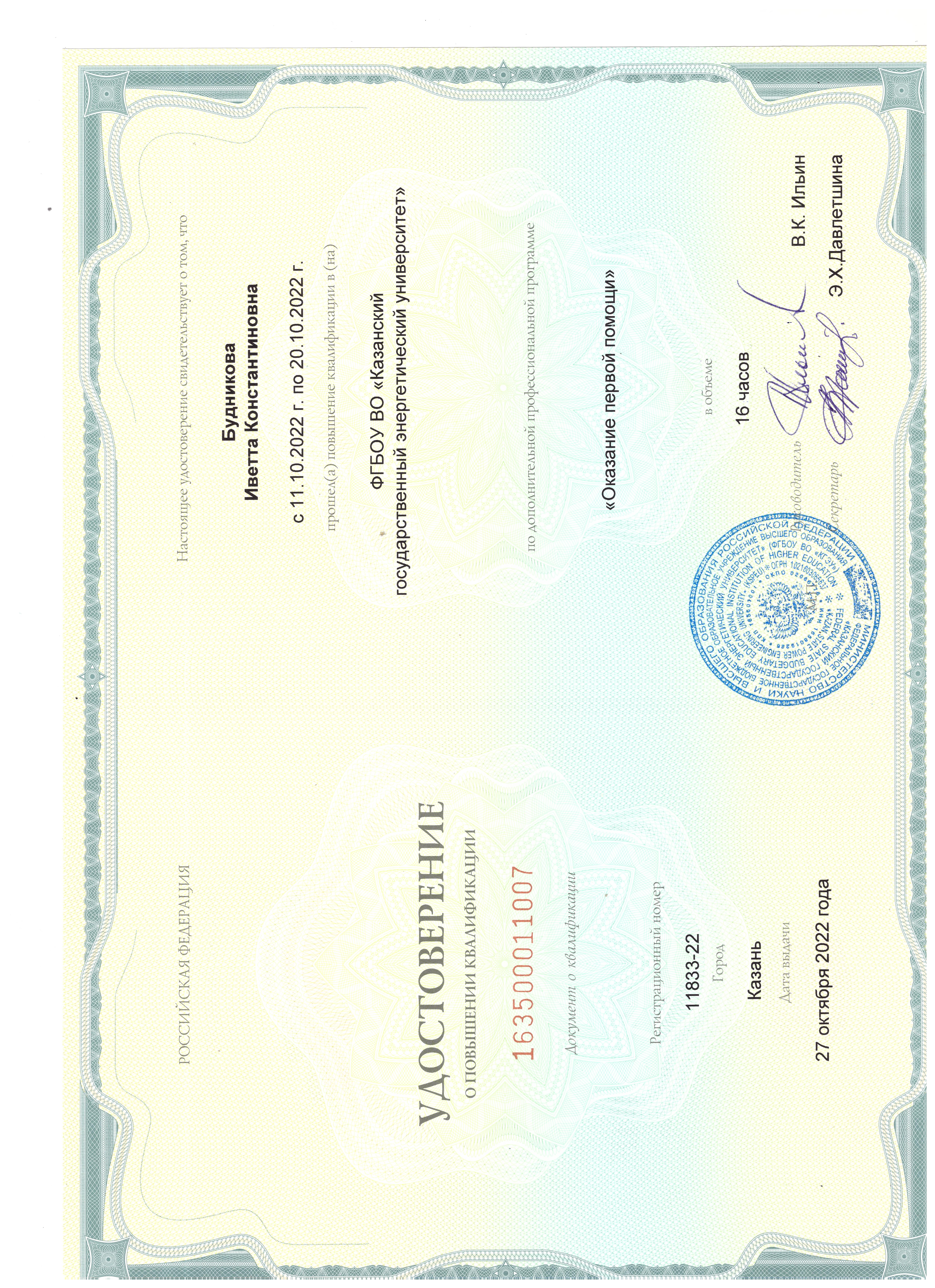 Будникова И.К., Давлетшина Л.А. Свидетельство о государствен-ной регистрации программы для ЭВМ № 2021681979, от 28.12.2021. |