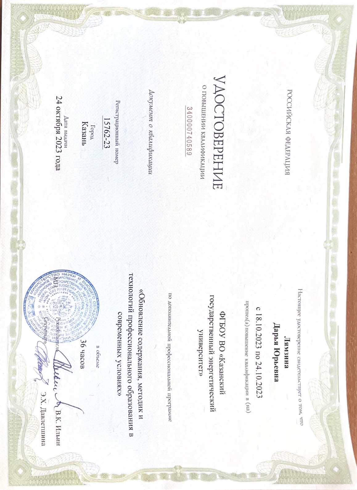 Повышение квалификации по дополнительной профессиональной программе «Обновление содержания, методик и технологий профессионального образования в современных условиях» |