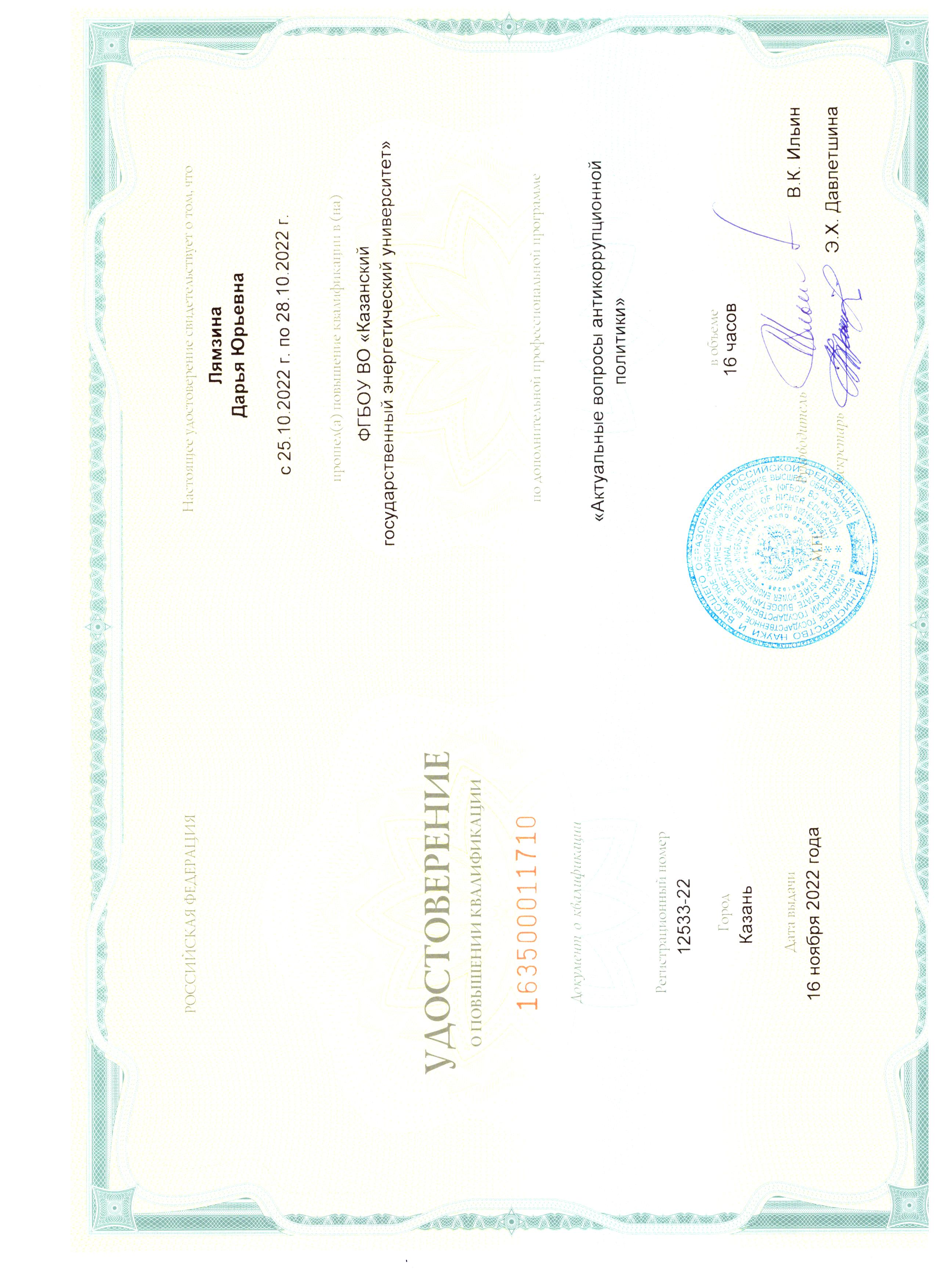 Повышение квалификации по дополнительной профессиональной программе "Актуальные вопросы антикоррупционной политики" |