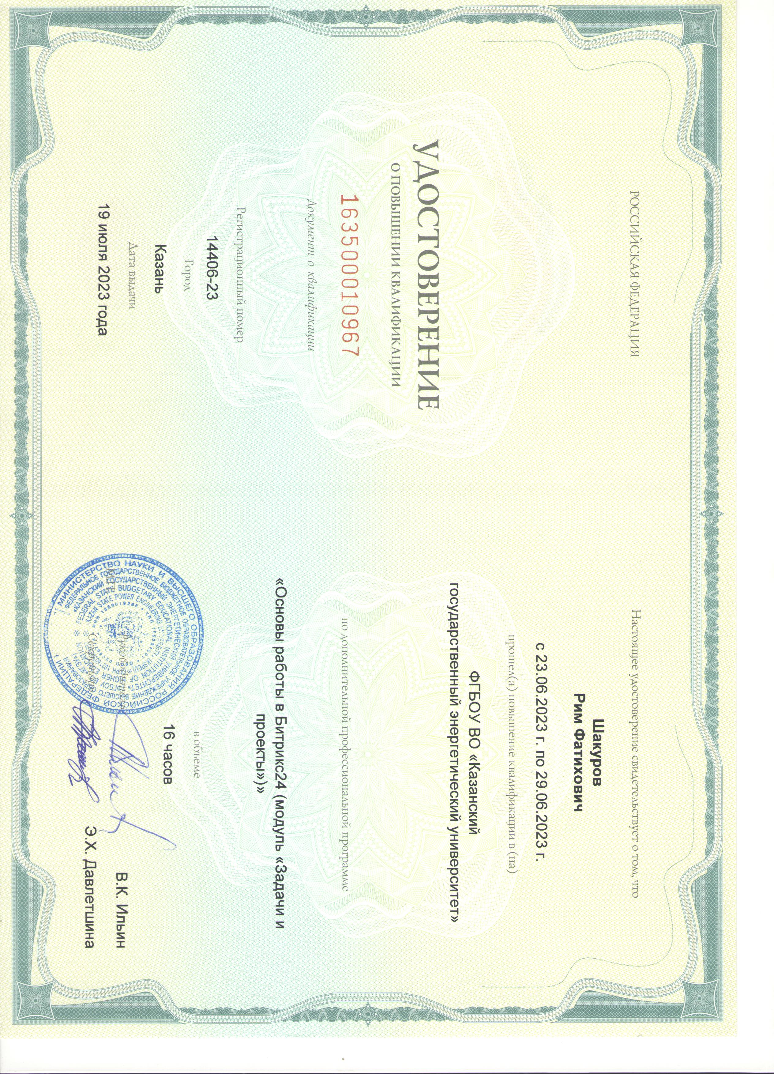 Удостоверение о повышении квалификации. "Основы работы в Битрикс24 (модуль "Задачи и проекты)" |