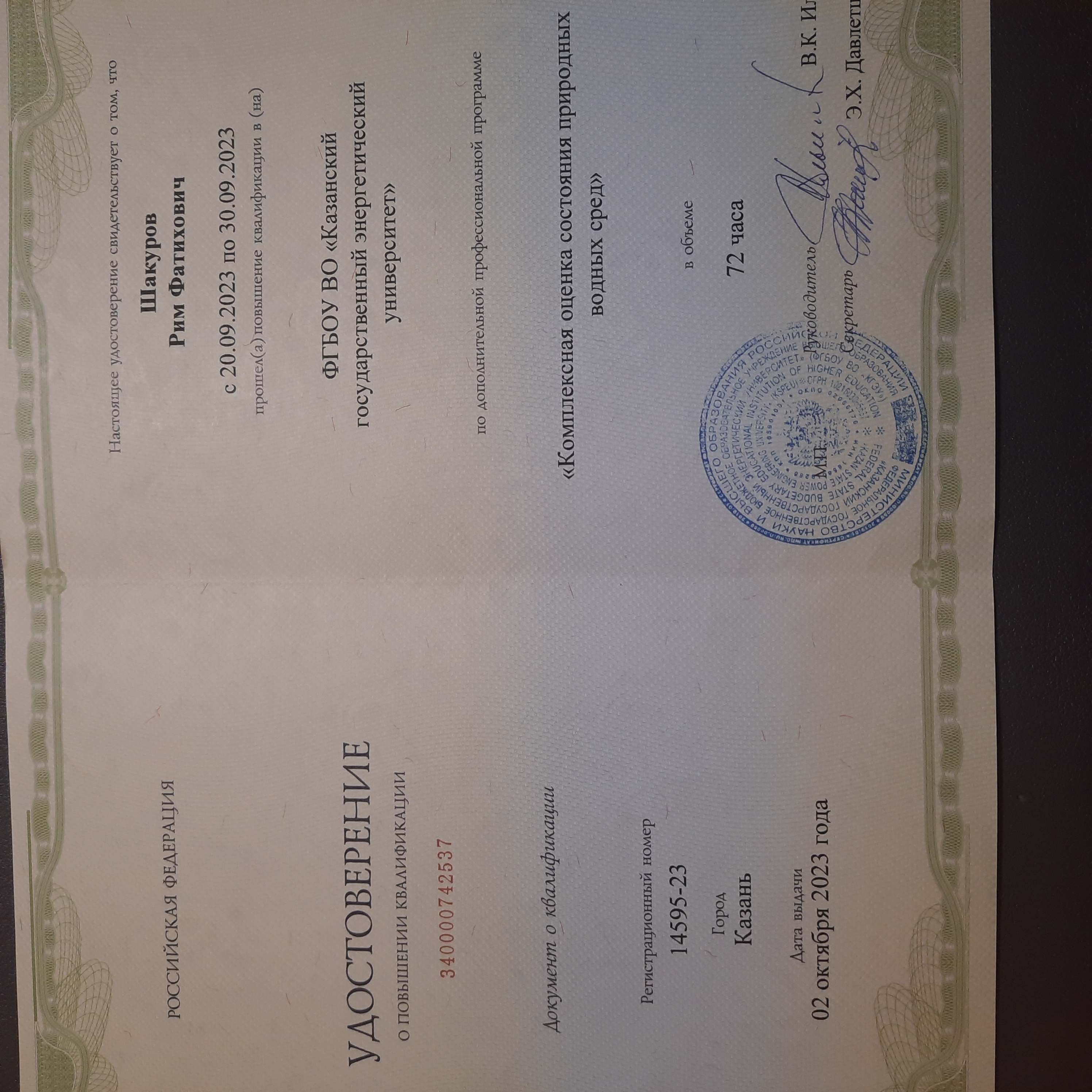 Удостоверение о повышении квалификации "Комплексная оценка состояния природных водных сред" |