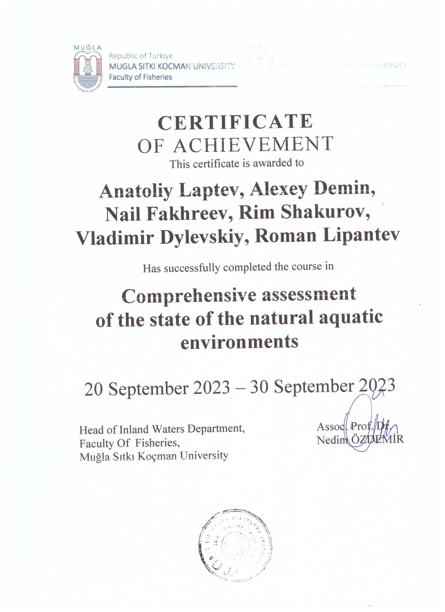 Sertifikate of achievement. Comprehensive assessment of the state of the natural aquatic environments |