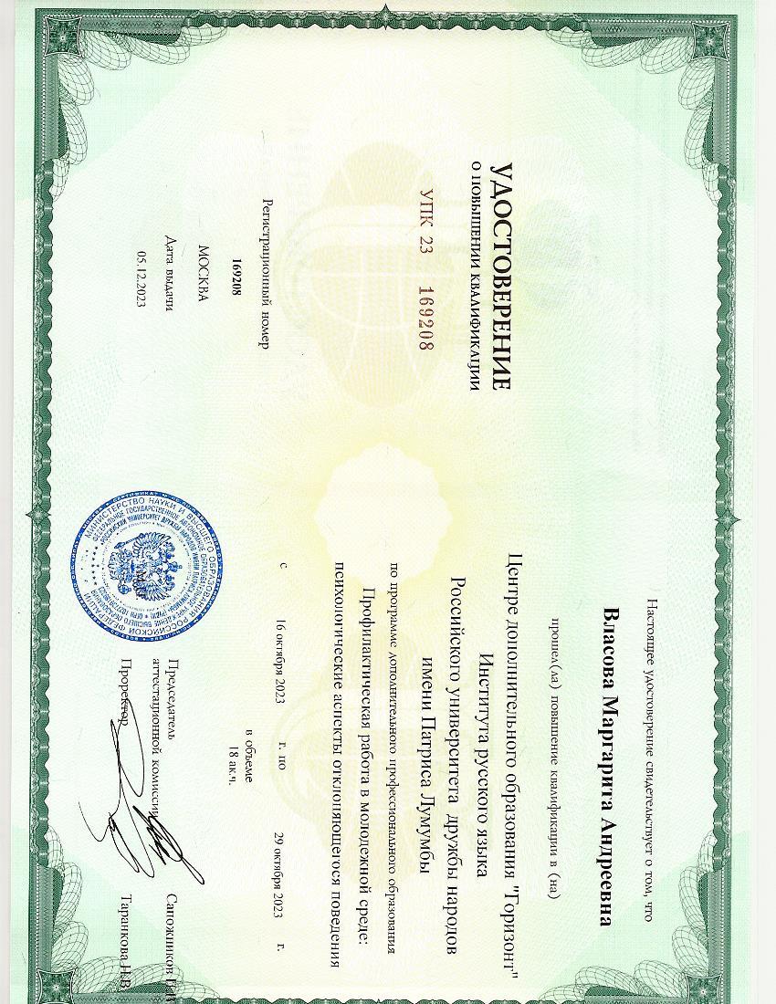Российский университет дружбы народов имени Патриса Лумумбы Профилактическая работа в молодежной среде: психологические аспекты отклоняющегося поведения 169208 05.12.2023 18
