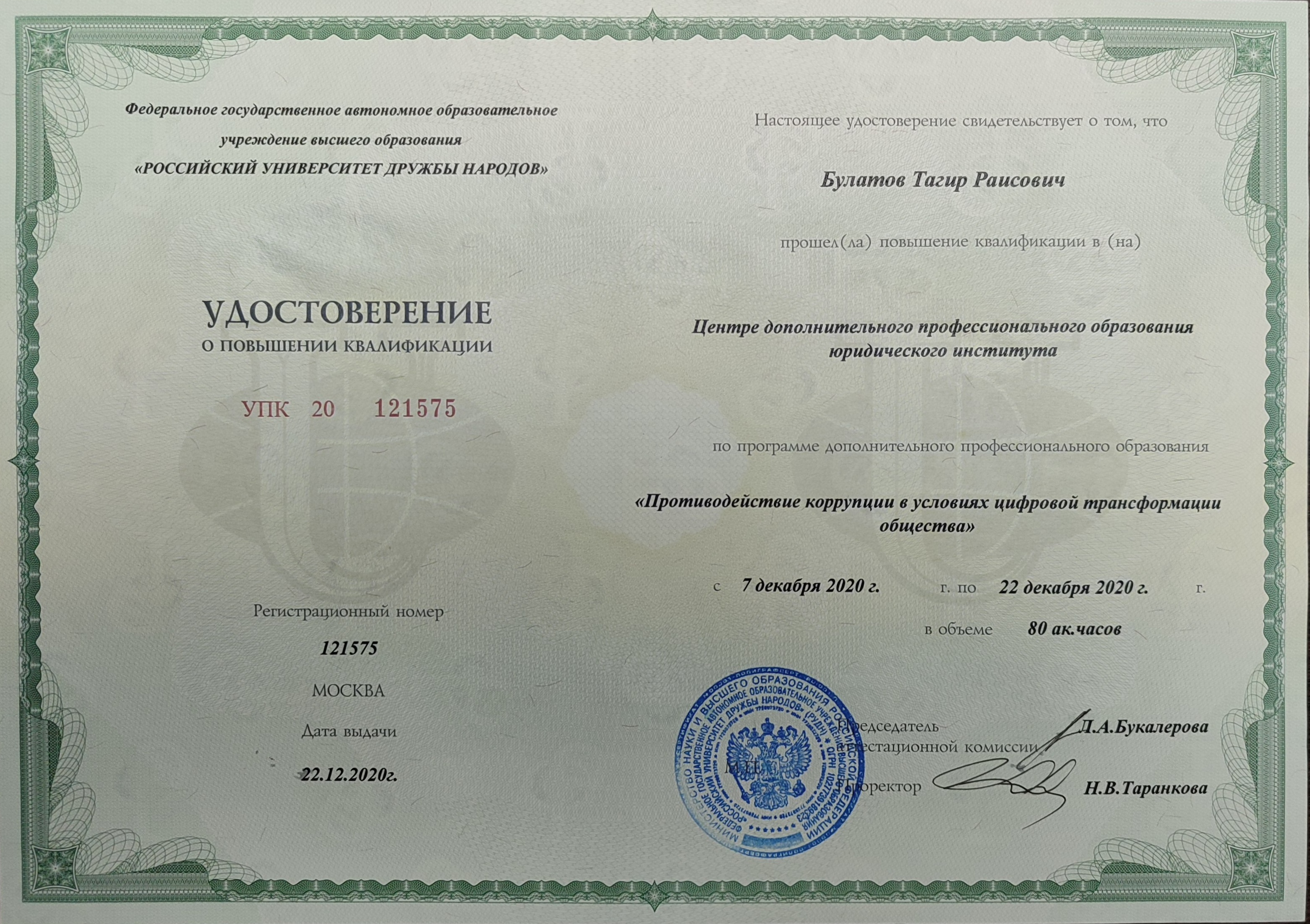 Федеральное государственное автономное образовательное учреждение высшего образования «Российский университет дружбы народов» Программа дополнительного образования «Противодействие коррупции в условиях цифровой трансформации общества» УПК 20 121575 22.12.2020 80