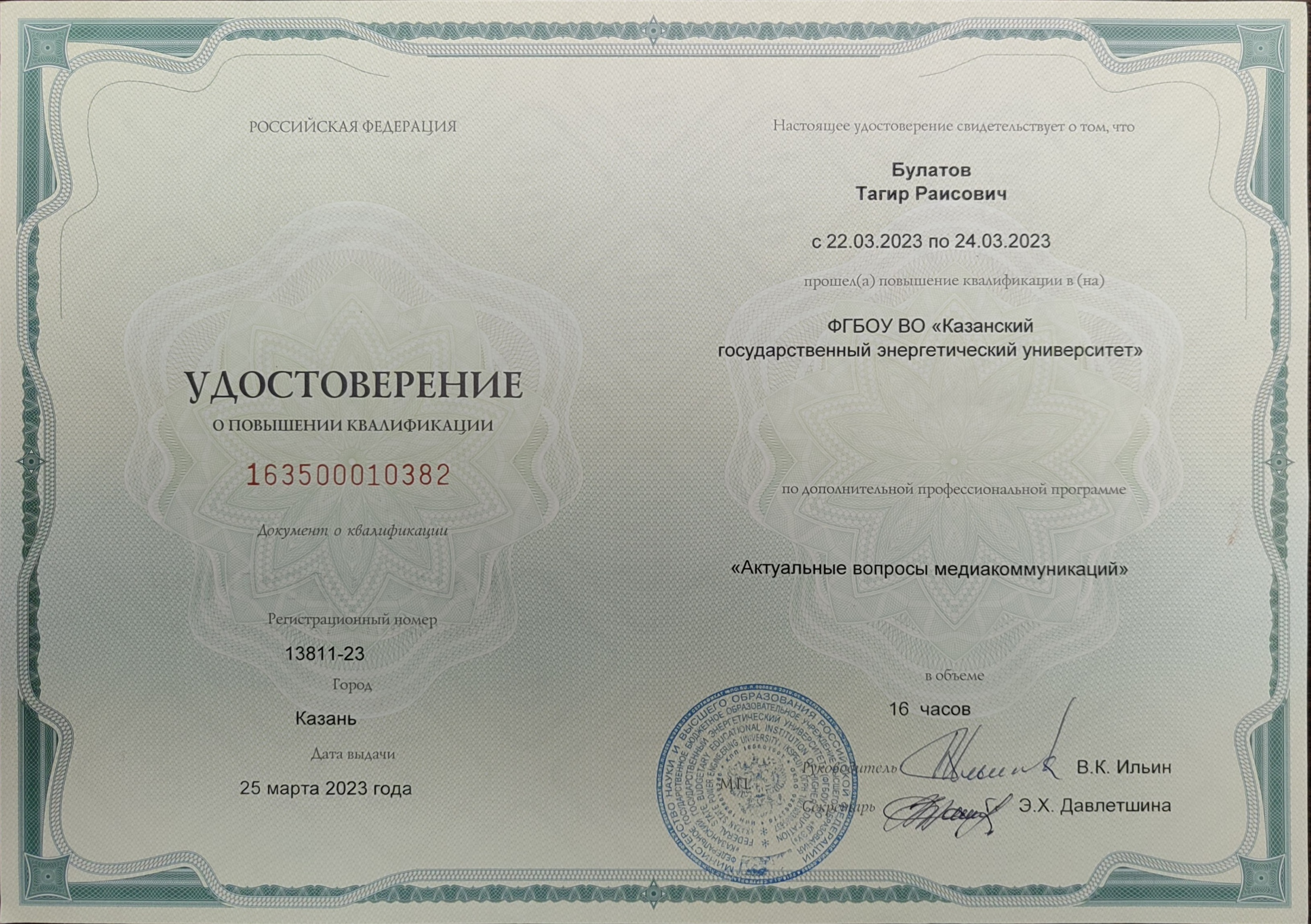 Федеральное государственное бюджетное образовательное учреждение высшего образования «Казанский государственный энергетический университет» Дополнительная профессиональная программа «Актуальные вопросы медиакоммуникаций» 163500010382 25.03.2023 16