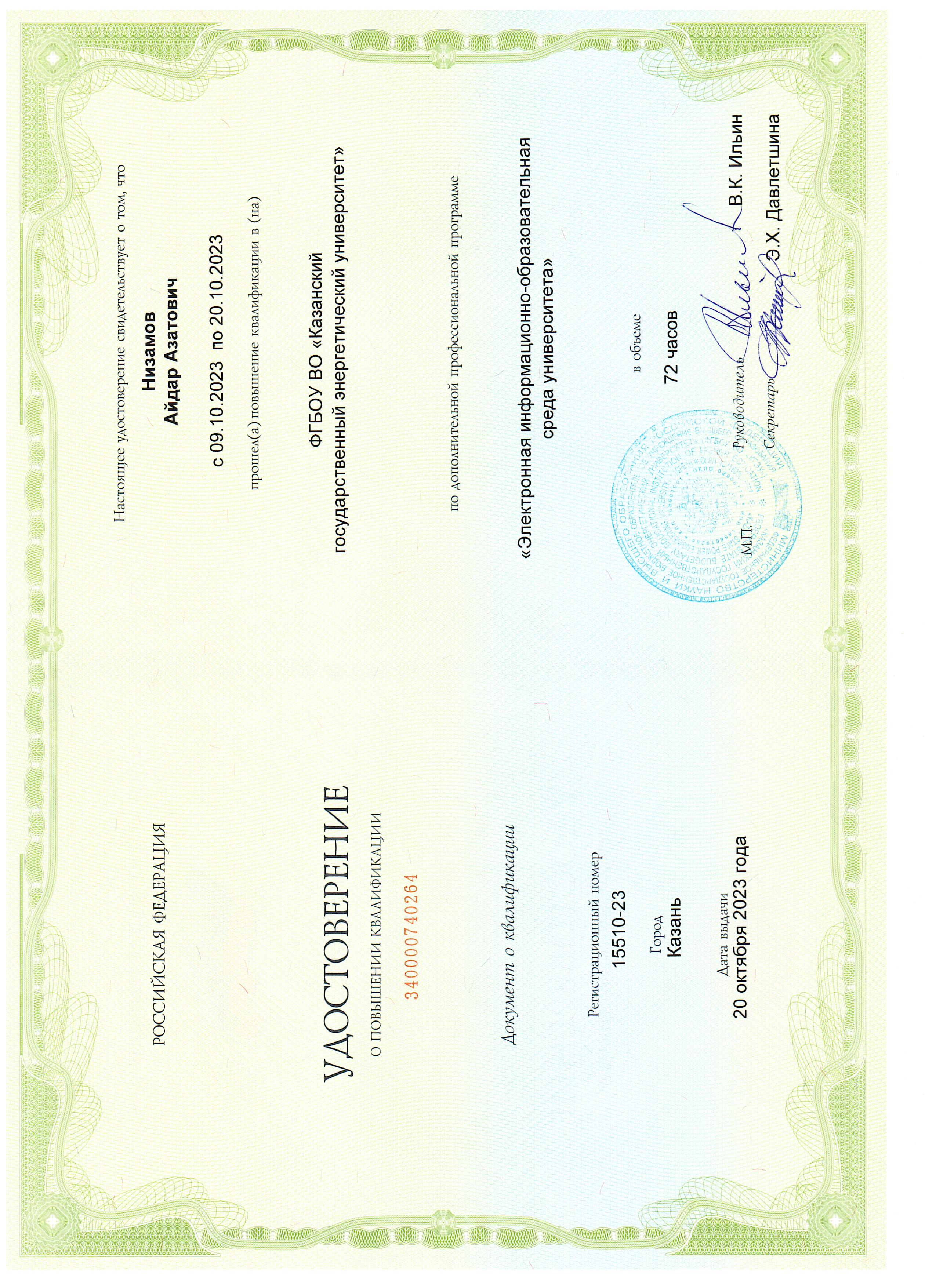 ФГБОУ ВО "Казанский государственный энергетический университет" Программа повышения квалификации "Электронная информационно-образовательная среда университета" 340000740264 20.10.2023 72