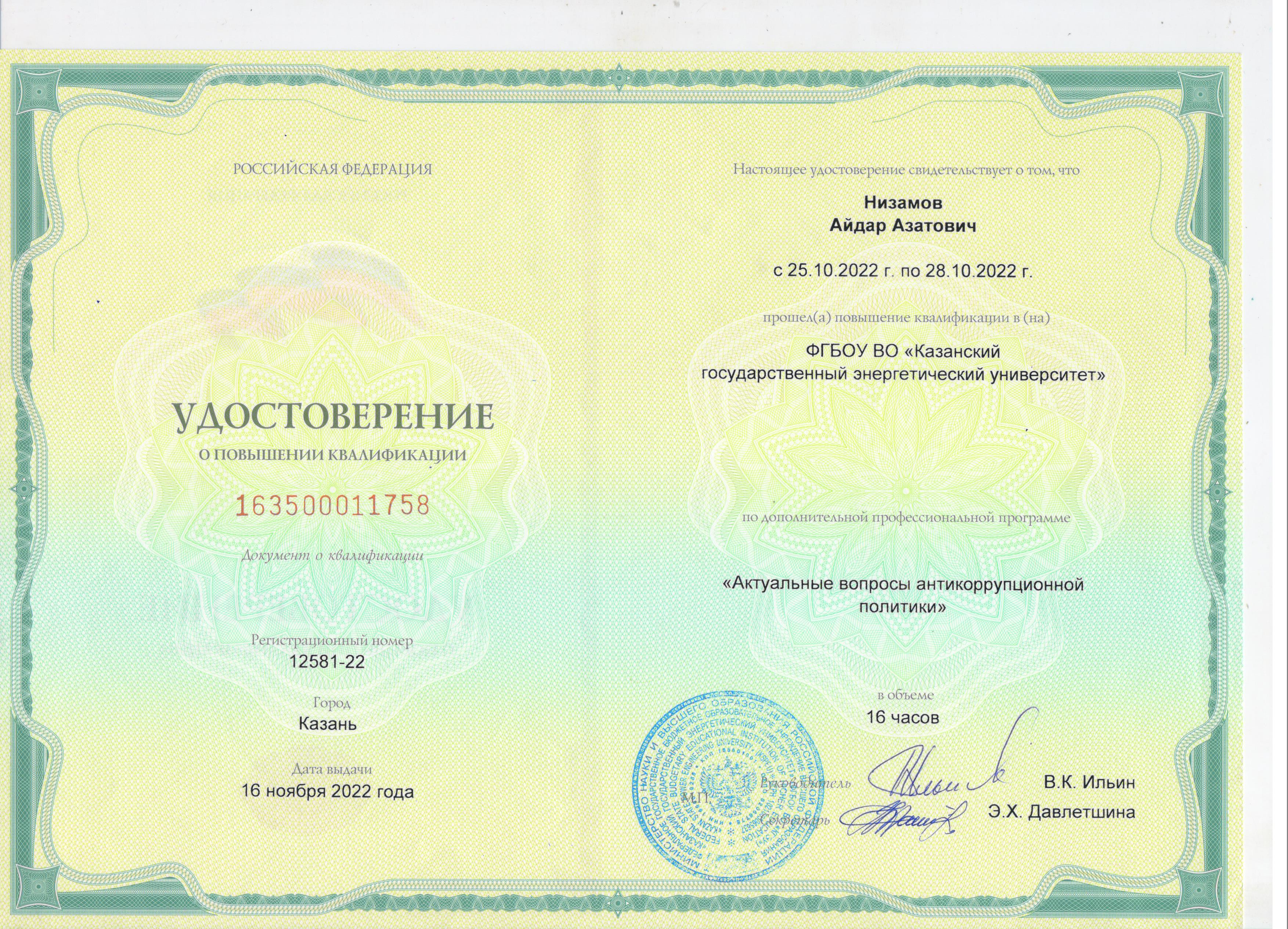 ФГБОУ ВО "Казанский государственный энергетический университет" Повышение квалификации по дополнительной профессиональной программе "Актуальные вопросы антикоррупционной политики" 163500011758 16.11.2022 16