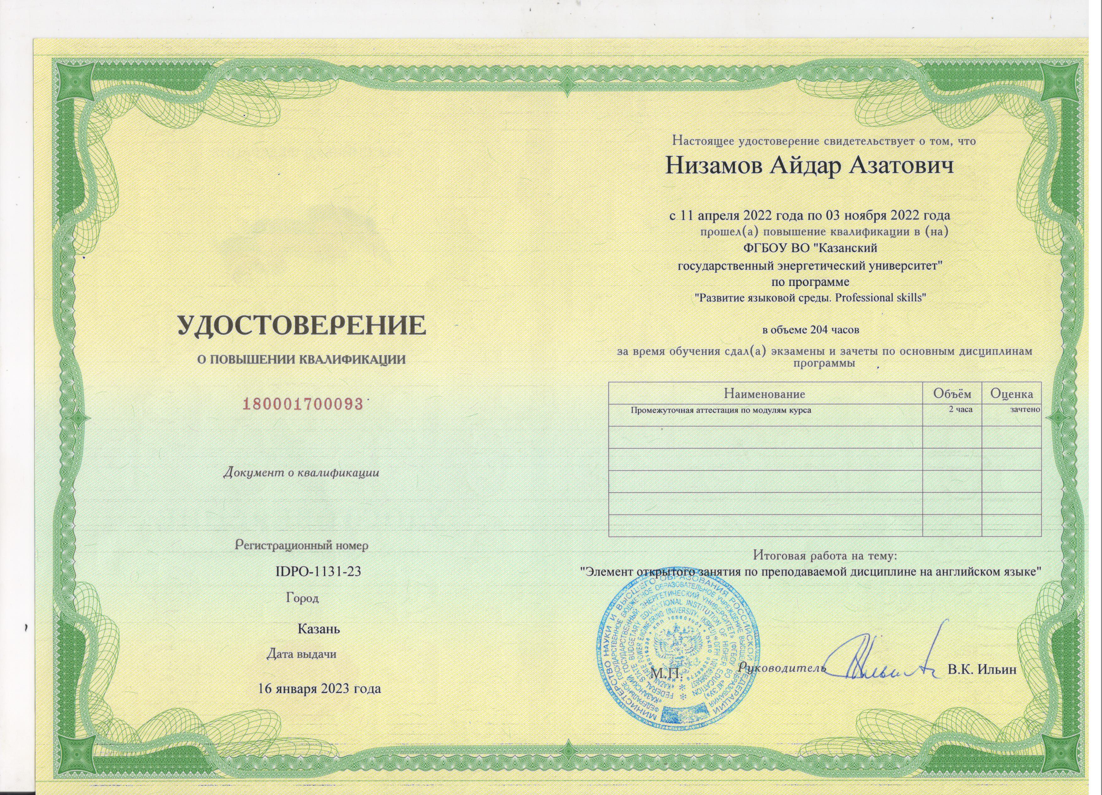 ФГБОУ ВО "КГЭУ" Повышение квалификации по программе "Развитие языковой среды. Professional skills" 180001700093 16.01.2023 204