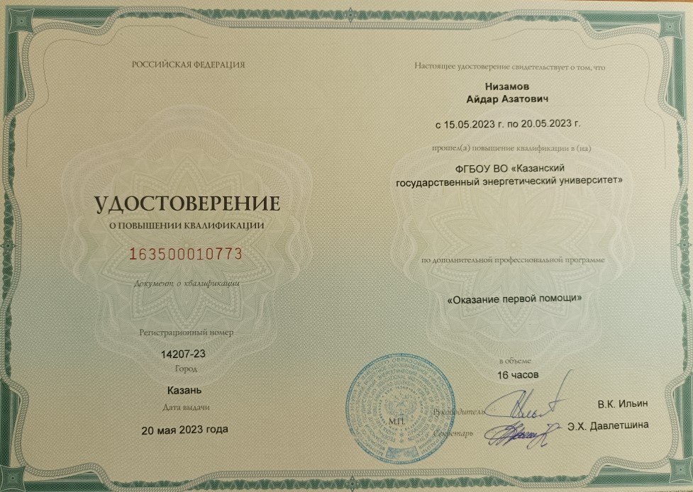 ФГБОУ ВО "Казанский государственный энергетический университет" Программа повышения квалификации "Оказание первой помощи" 163500010773 20.05.2023 16