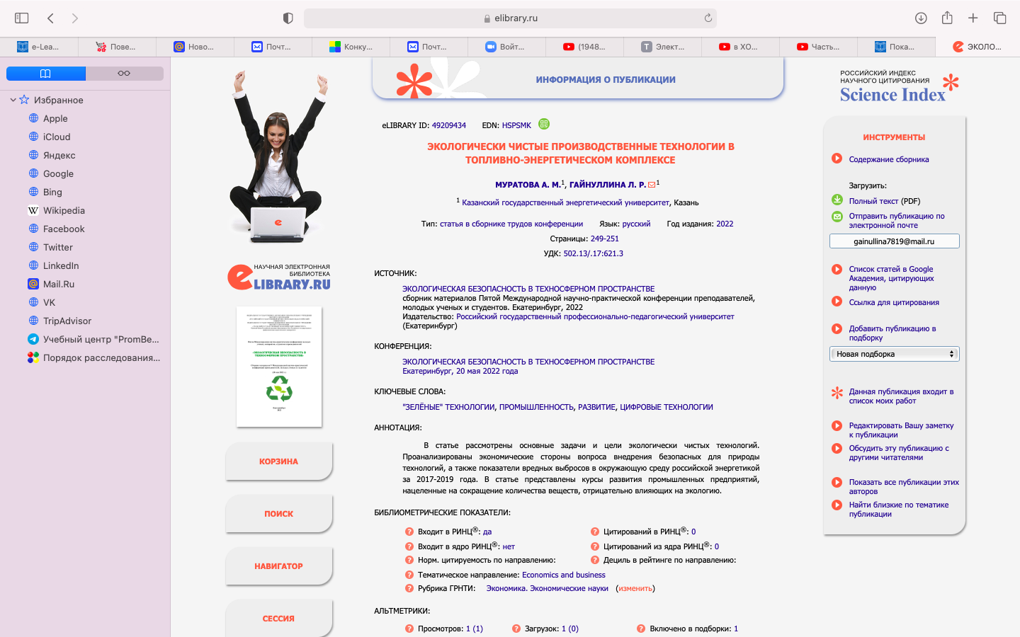 В сборнике: Экологическая безопасность в техносферном пространстве. сборник материалов Пятой Международной научно-практической конференции преподавателей, молодых ученых и студентов. Екатеринбург, 2022. С. 249-251. |