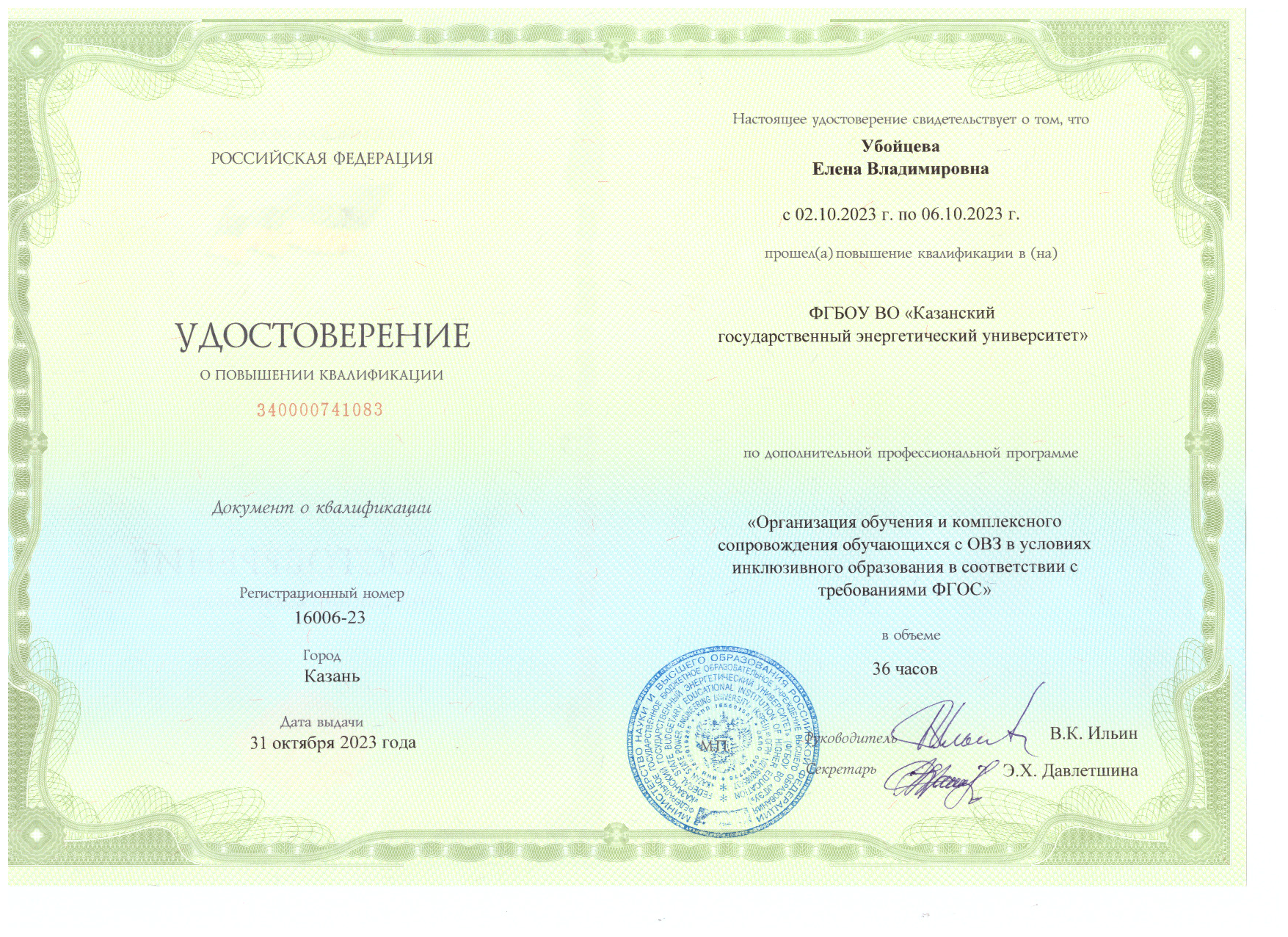 ФГБОУ ВО "КГЭУ" Организация обучения и комплексного сопровождения обучающихся с ОВЗ в условиях инклюзивного образования в соответствии с требованиями ФГОС 16006-23 31.10.2023 36
