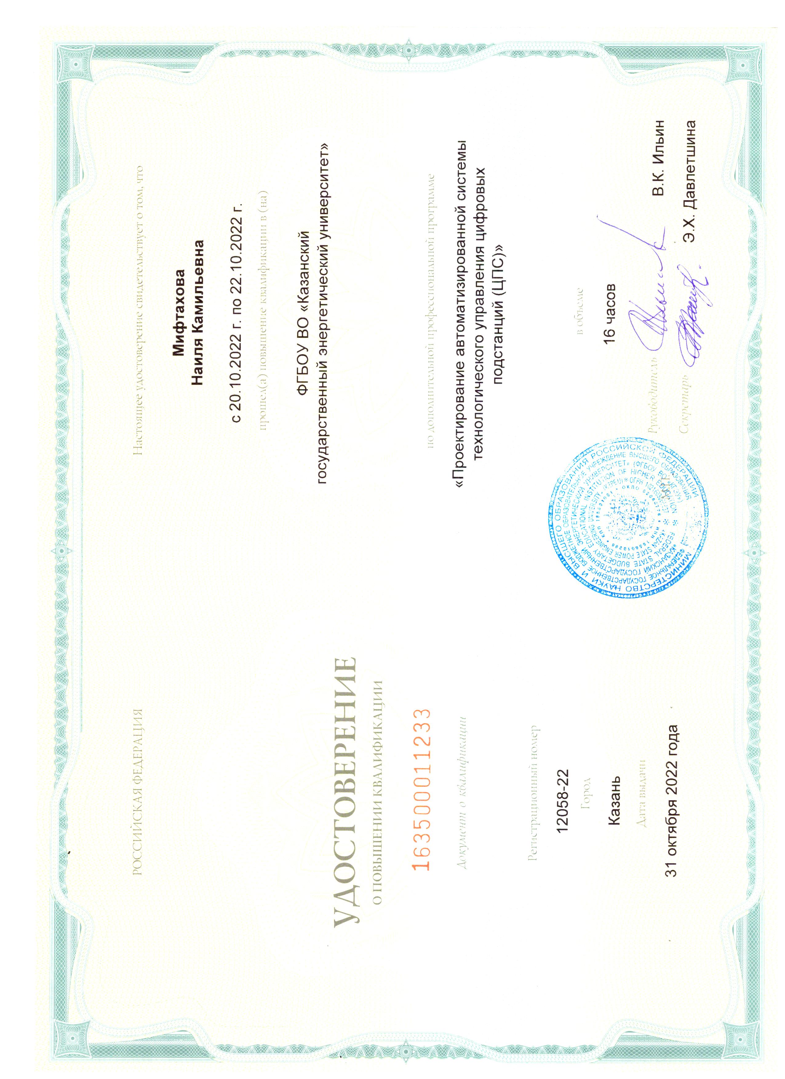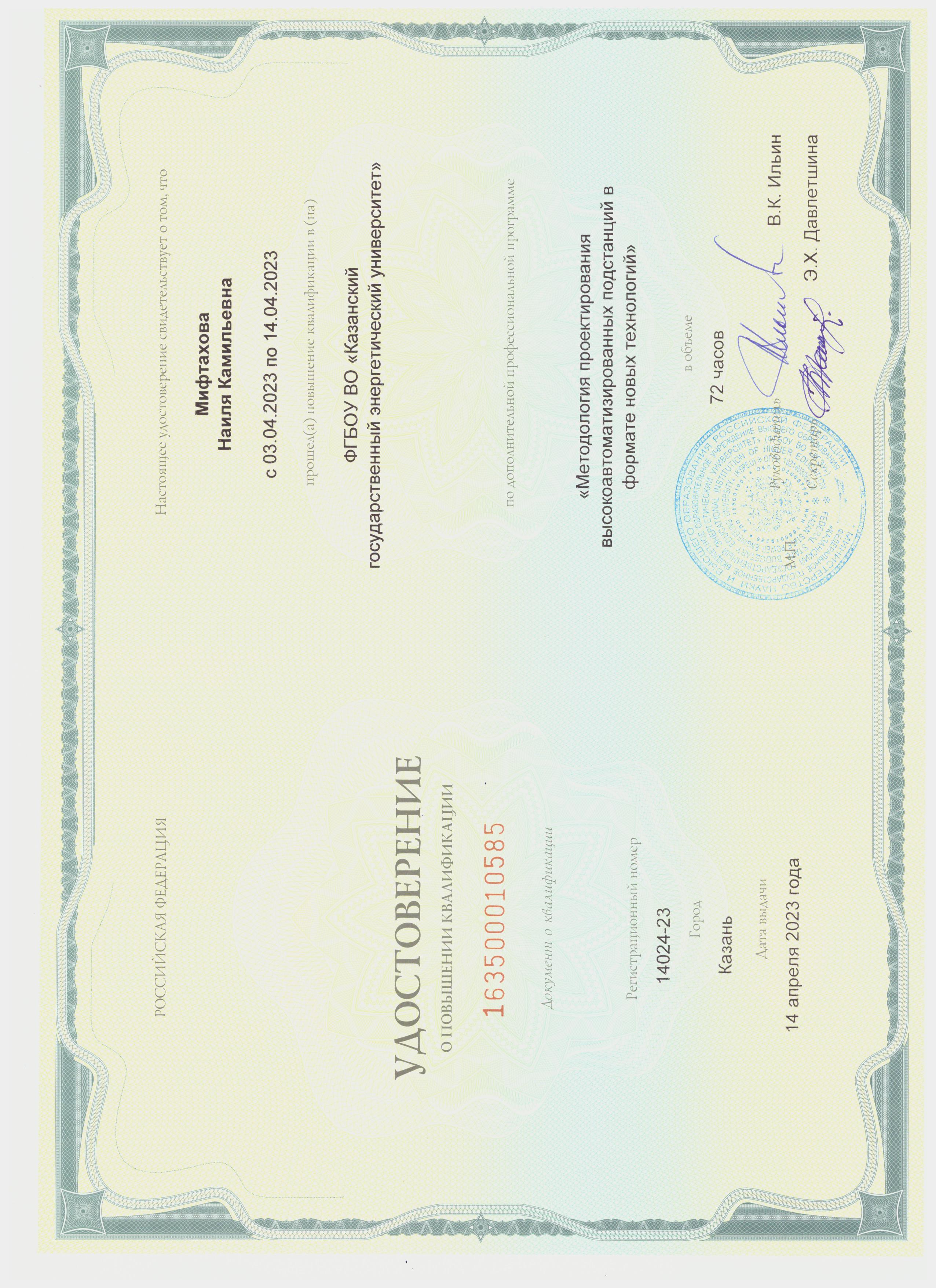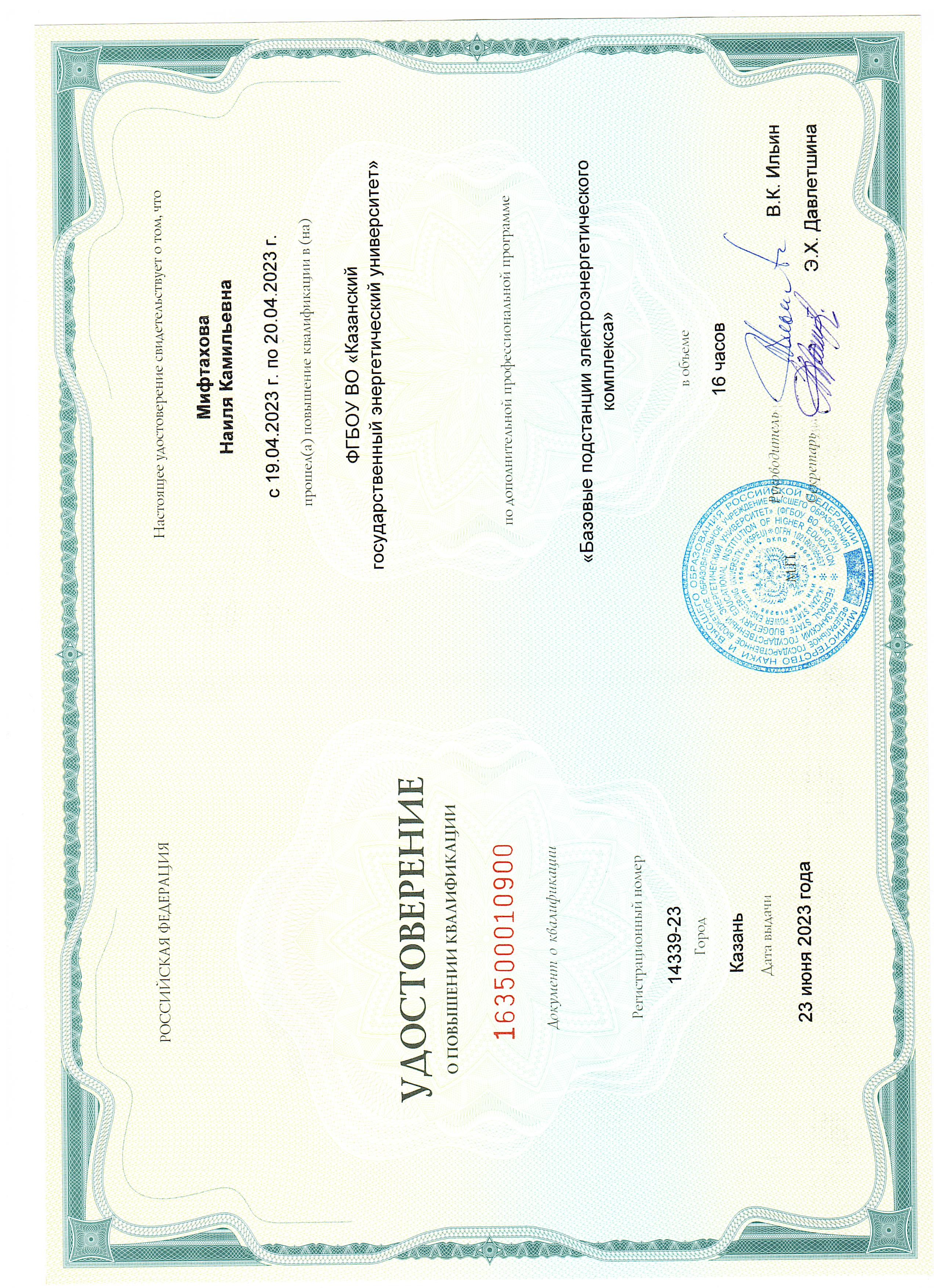 За высокий профессионализм и добросовестный труд по подготовке специалистов-энергетиков отмечена благодарственным письмом ректора КГЭУ Приказ от 10.12.12.2012г. № 2249/ок