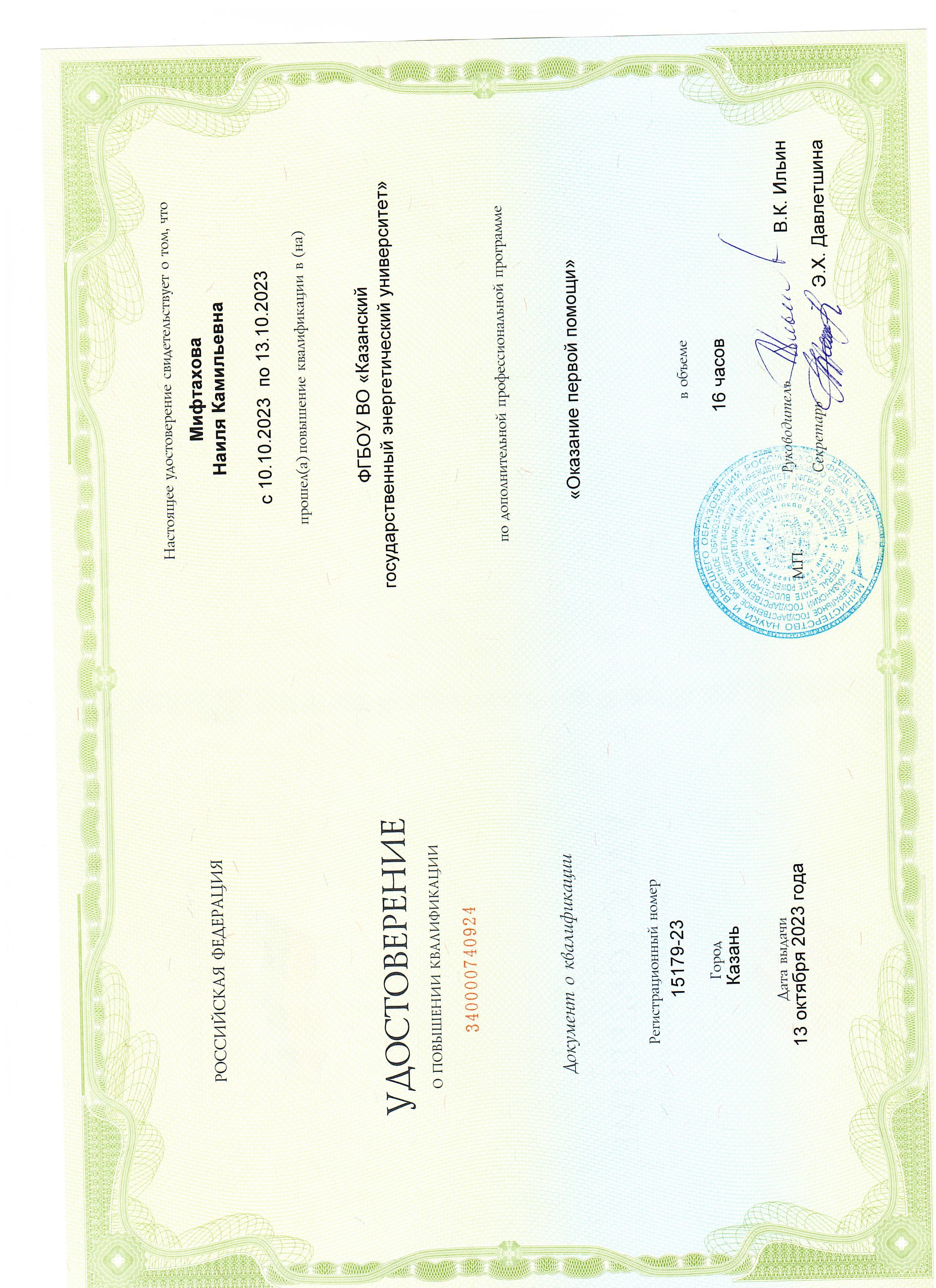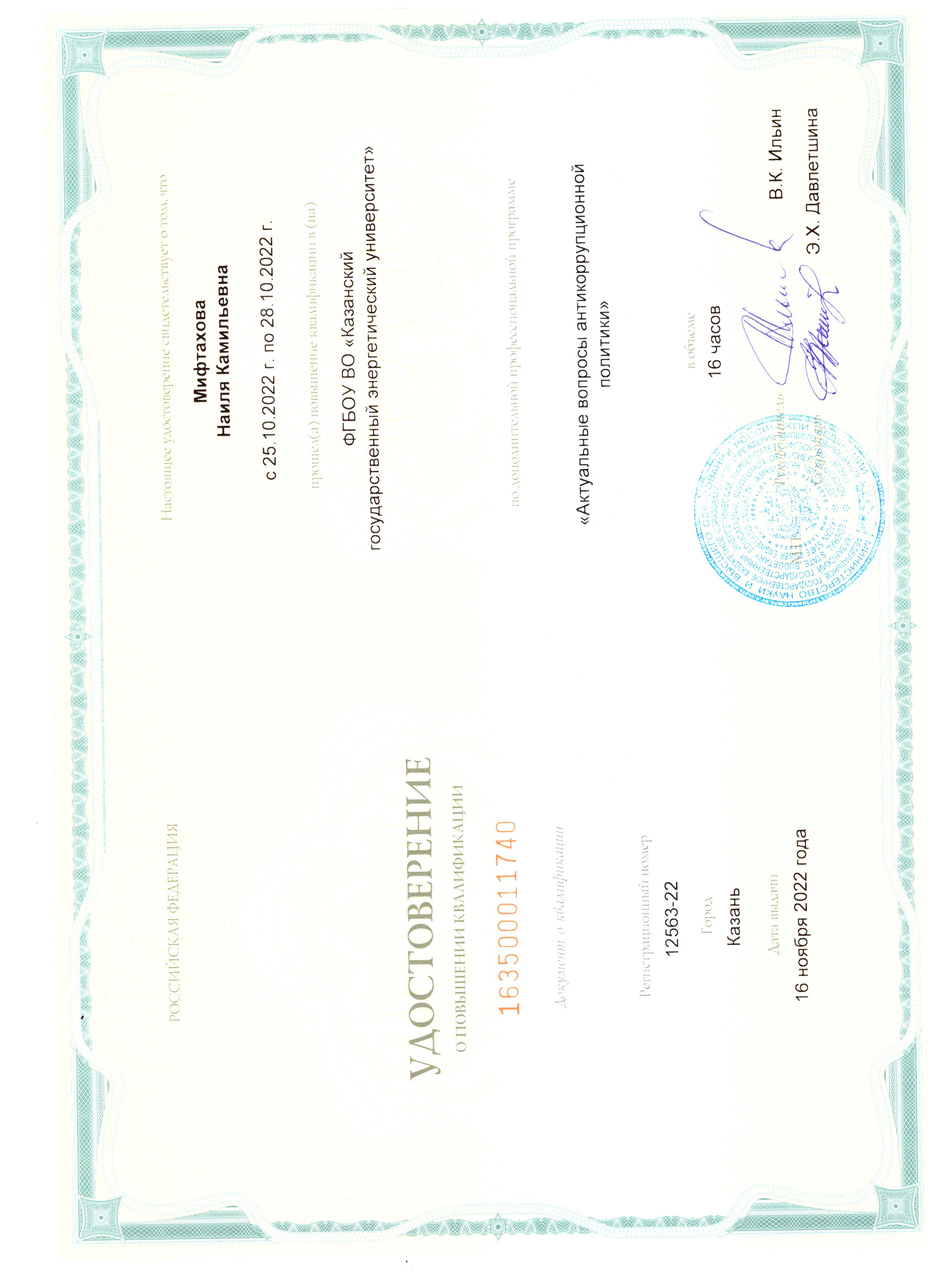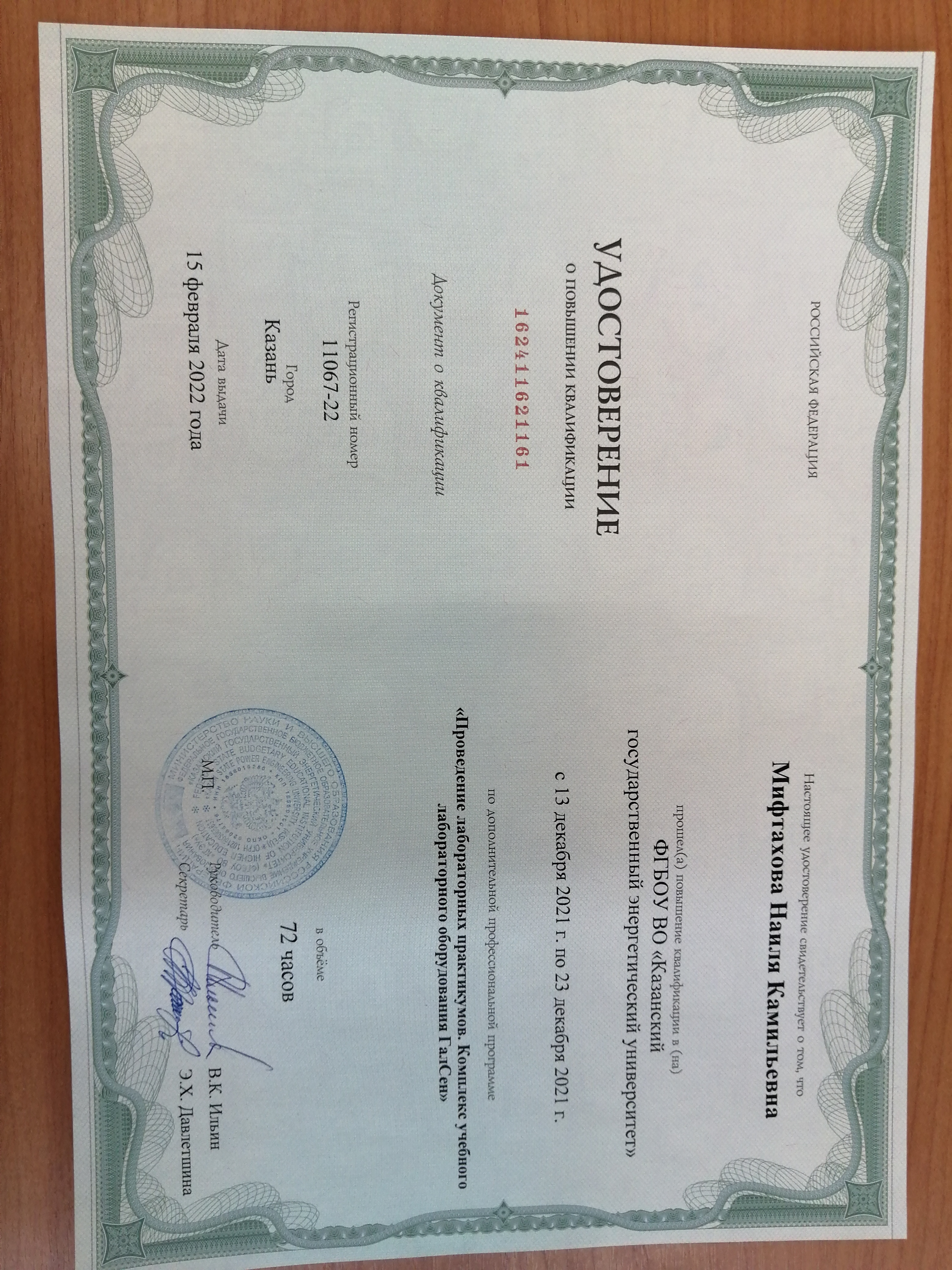 За высокий профессионализм и добросовестный труд по подготовке специалистов-энергетиков отмечена благодарственным письмом ректора КГЭУ Приказ от 10.12.12.2012г. № 2249/ок