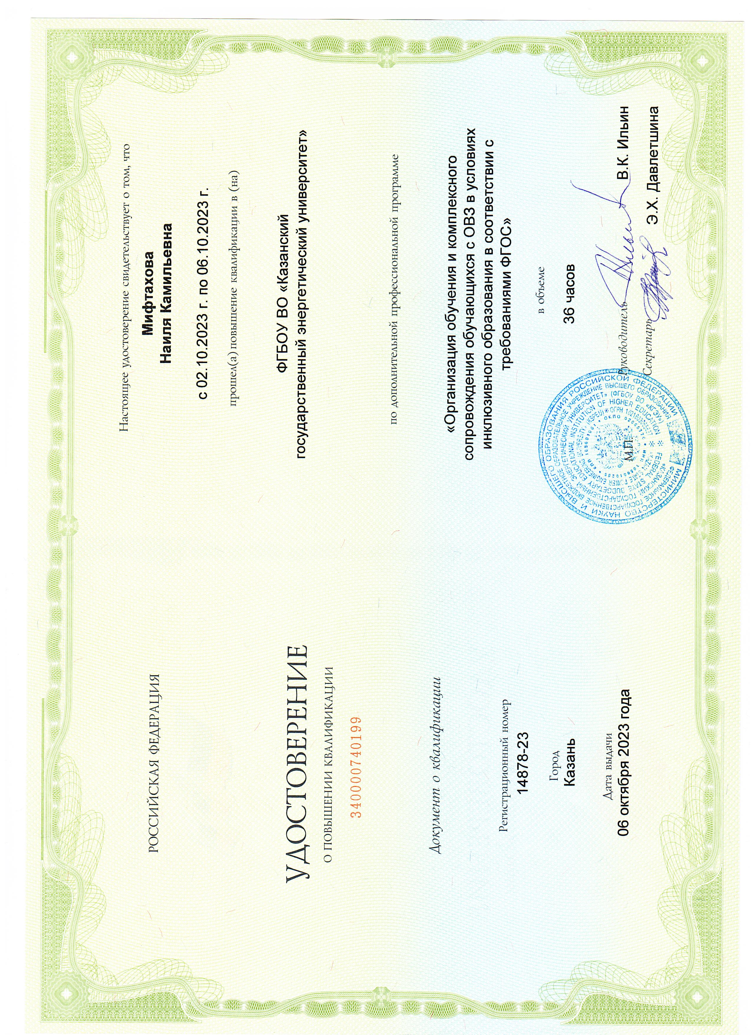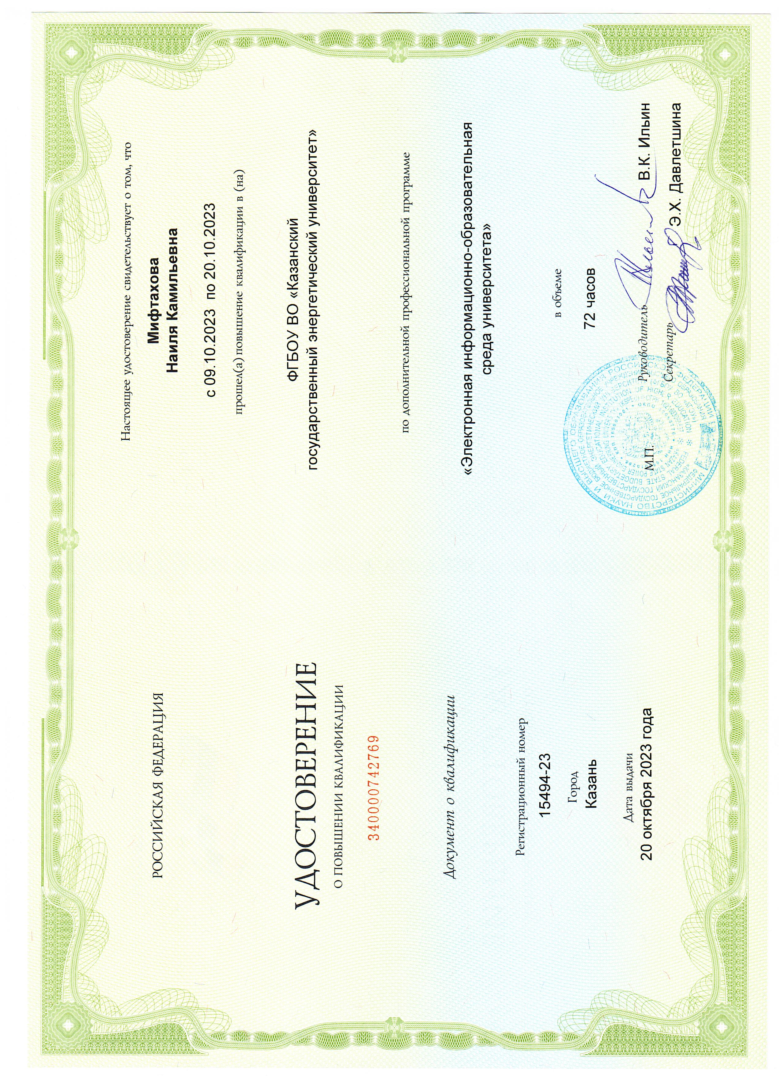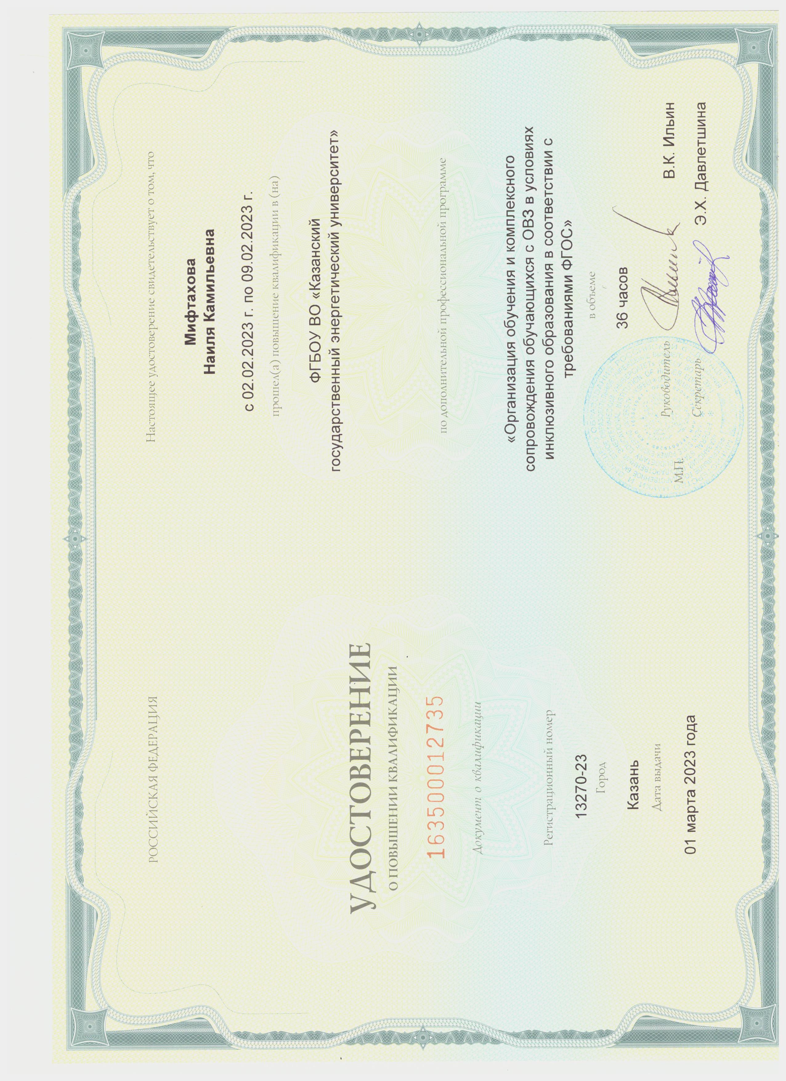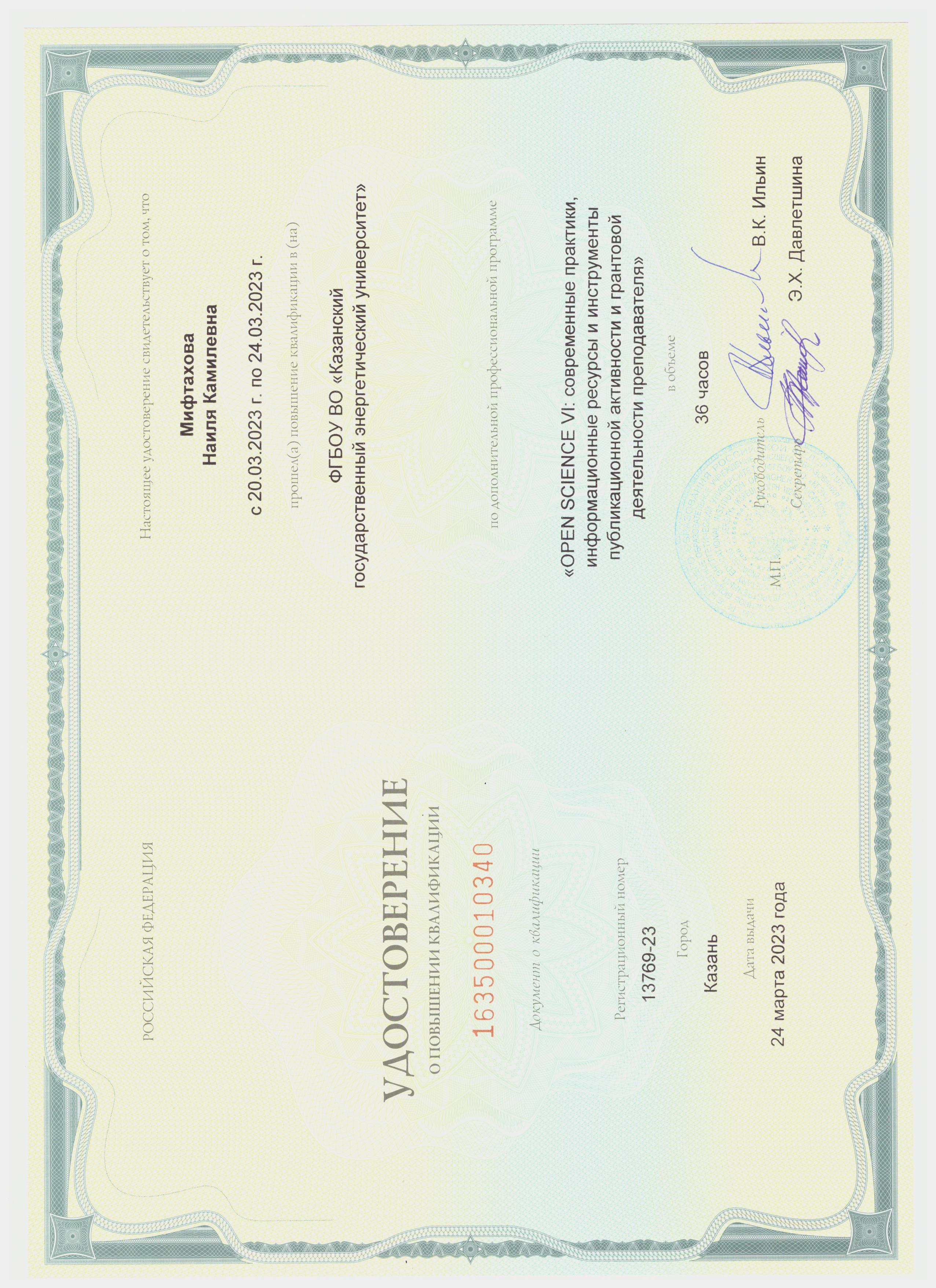 Благодарность Министерства образования и науки Республики Татарстан за долголетнюю плодотворную работу в системе высшего профессионального образования (Приказ от 01.11.2017 г. № 437-н).