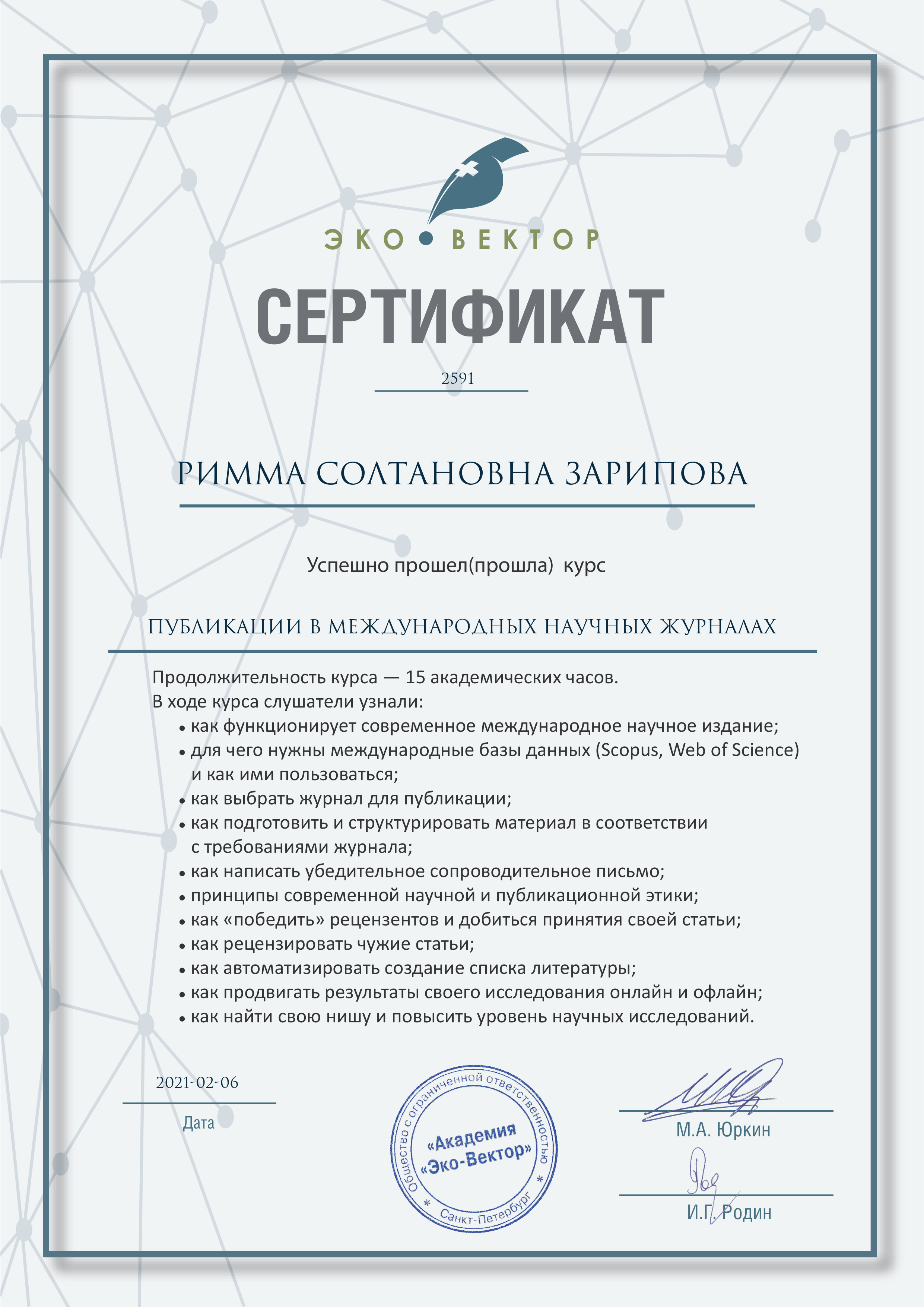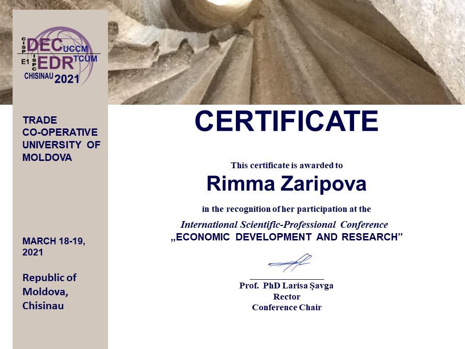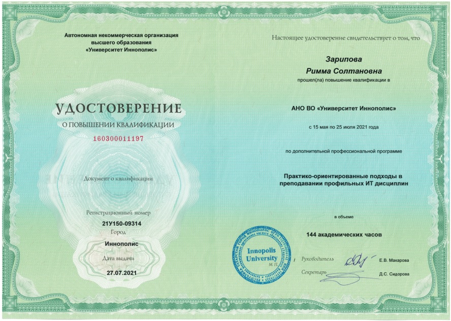 SCOPUS, Web Of Science: R. Zaripova, А. Porunov, R.Zinurova, R.Galyamov, G.Stepanova. The Role of Practice-Oriented Education in the Development of the Country’s Economy // New Silk Road: Business Cooperation and Prospective of Economic Development (NSRBCPED 2019), Advances in Economics, Business and Management Research, volume 131, 2019, P.663 |