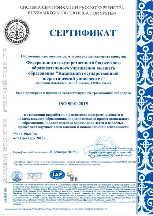 В 2016 г. пройдена сертификация и подтверждена эффективность СМК КГЭУ на соответствие международному стандарту ИСО 9001:2015 сертификатами в системе сертификации Русского Регистра и Международной сети органов по сертификации IQNet.