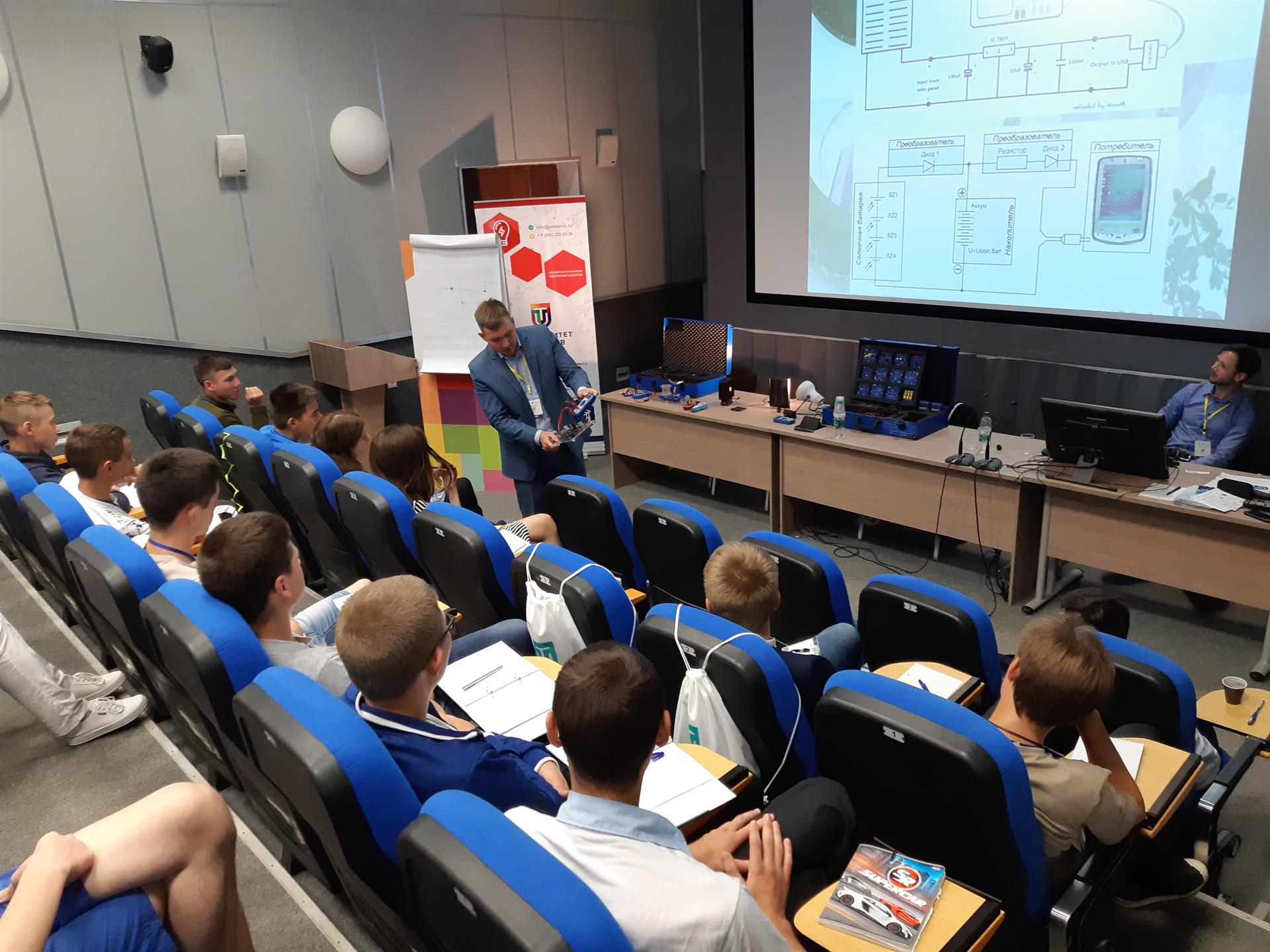 В г. Казань с 18 по 25 августа 2018 г. прошла Молодежная школа талантов (МШТ), которая собрала более 400 участников. МШТ - это акселерационная образовательная программа для талантливой молодежи от 14 до 30 лет и наставников со всего Татарстана, которая помогает освоить ключевые навыки реализации проектов, «прокачать» свою персональную стратегию развития и компетенции будущего вместе с ведущими тренерами, расширить круг профессиональных и личных связей, найти новые возможности для самореализации. В рамках МШТ были проведены открытые лекции для более 40 участников на тему "Альтернативные источники энергии» и мастер-классы по сборке своего зарядного устройства на солнечных батареях".