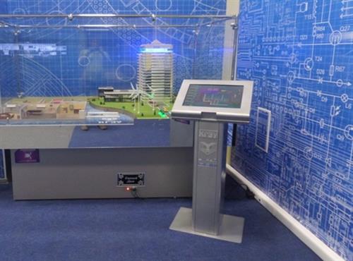 Макет «Умный дом» представляет собой наглядную модель жилого дома современного типа, оснащенного такими инженерными системами как водоснабжение, теплоснабжение, электроснабжение, освещение, вентиляция, видеонаблюдение. Управление всеми инженерными системами «Умного дома» происходит в автоматическом режиме с помощью интерактивной стойки.