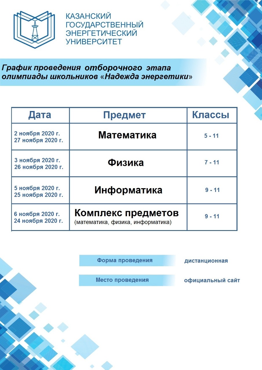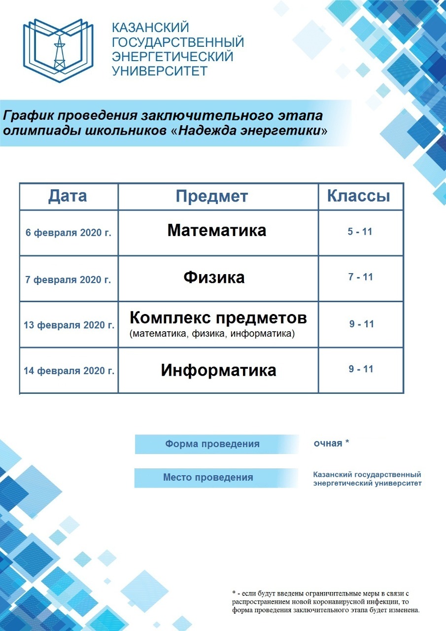 Заключительный этап олимпиады проводится только в очной форме на базе СФУ и региональных площадок, в том числе КГЭУ с 25 января по 23 марта 2021 г.