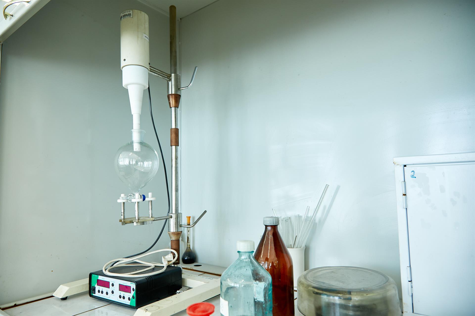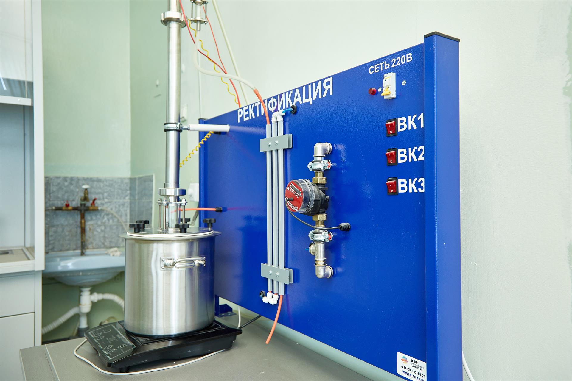 Лабораторная установка предназначена для изучения фазовых переходов в сложных растворах при ректификации этилового спирта с использованием электрического нагревателя и периодической заправки спиртосодержащего сырья.