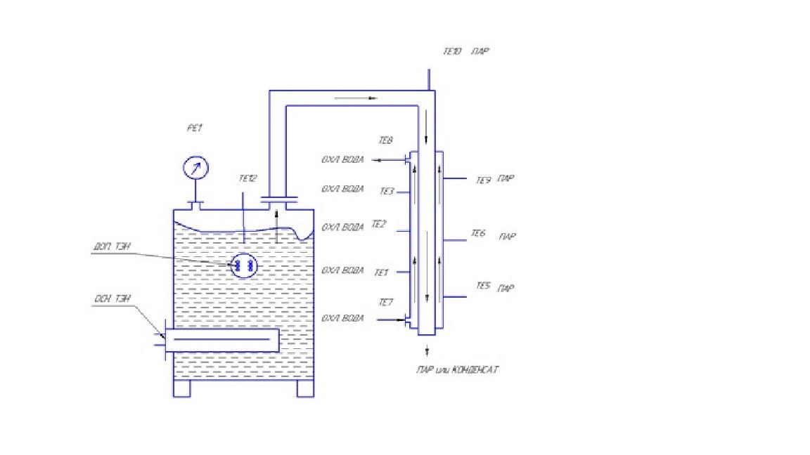 Стенд состоит из бака с тепло – электронагревателем (ТЭН), которые предназначены для испарения воды. Образовавшийся пар по трубе поступает в теплообменике типа «труба в трубе» , где в противоточном режиме с водой происходит конденсация. Установка оборудована датчиками (термопарами) для измерения температуры в баке, а так же профиля температуры охлаждающей воды в теплообменнике. Так же измеряется расход охлаждающей воды и конденсата.