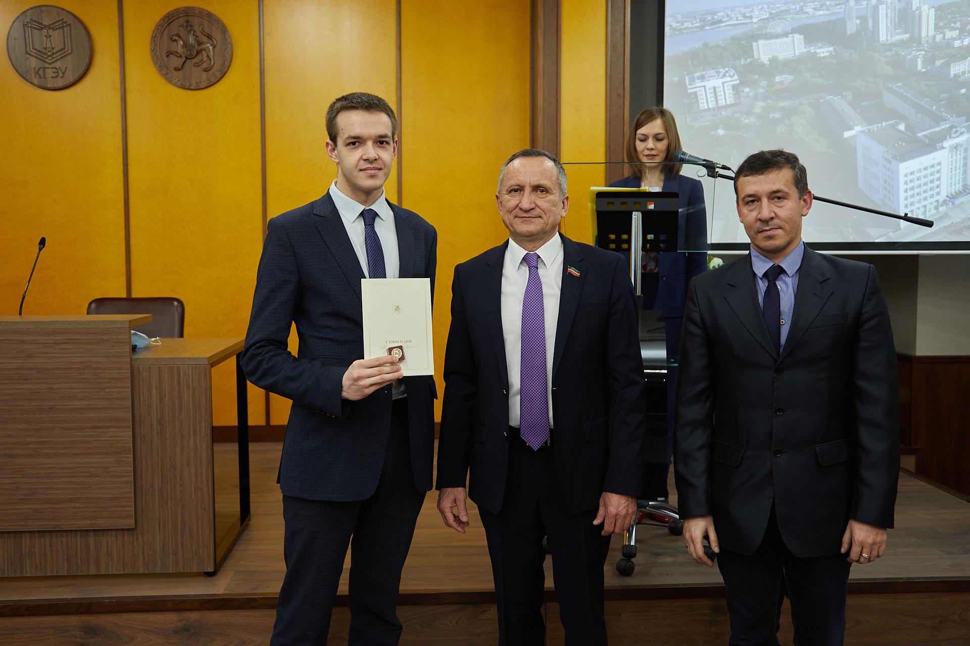 Участники заседания поздравили студентов-стипендиатов мэра Казани за отличную учебу и успехи в научно-исследовательской работе по итогам 2019/2020 учебного года: Артема Байнова (научный руководитель – кандидат технических наук Людмила Плотникова), Веронику Ершову (научный руководитель – кандидат технических наук Александр Богданов), Диану Паненко (научный руководитель – доктор химических наук, профессор Наталия Чичирова), студента Казанского энергетического колледжа Илью Графова (научный руководитель – Ольга Графова) и аспиранта КГЭУ Вадима Зиннурова (научный руководитель – доктор технических наук Андрей Дмитриев).