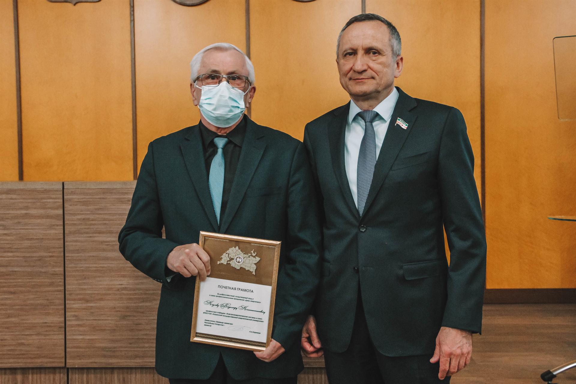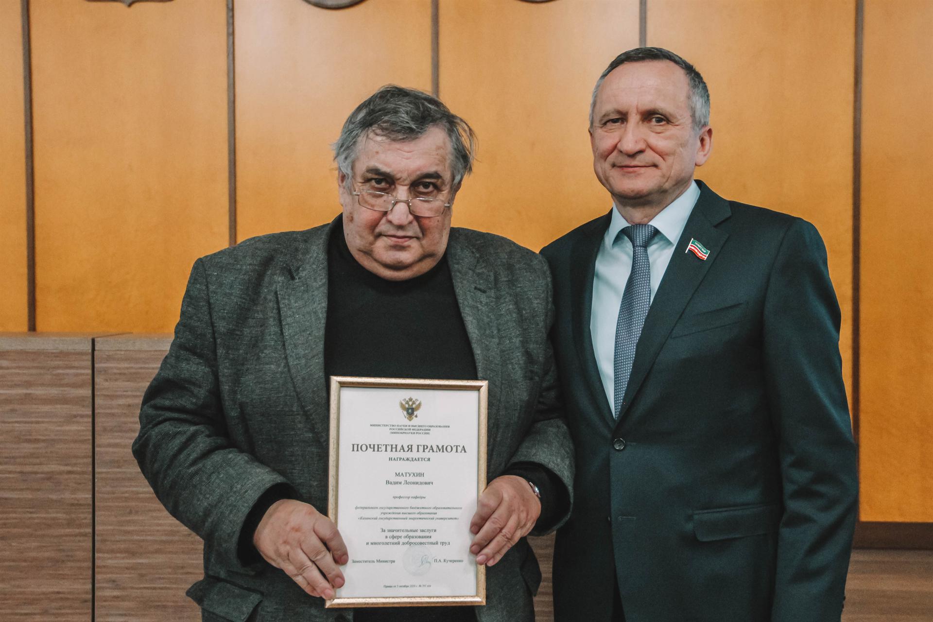 За добросовестный, плодотворный труд и в связи с профессиональным праздником «День энергетика», почетную грамоту министерства промышленности и торговли РТ вручили профессору кафедры «Электроэнергетические системы и сети» доктору физико-математических наук Владимиру Козлову.