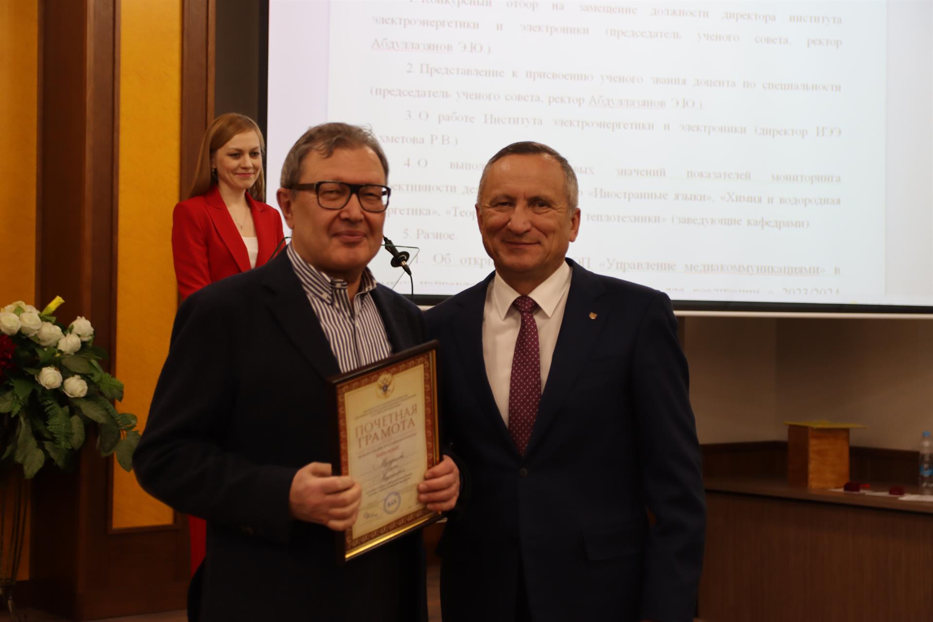 За большие заслуги в работе по аттестации научных и научно-педагогических кадров Почетной грамотой Высшей аттестационной комиссии при министерстве науки и высшего образования РФ наградили доктора политических наук, профессора кафедры «Социология, политология и право» Наиля Мухарямова. Аттестаты доцентов по специальности вручили директору Института электроэнергетики и электроники, кандидату технических наук Римме Ахметовой, доктор технических наук Алексею Демину и кандидату педагогических наук Зумейре Шакуровой.