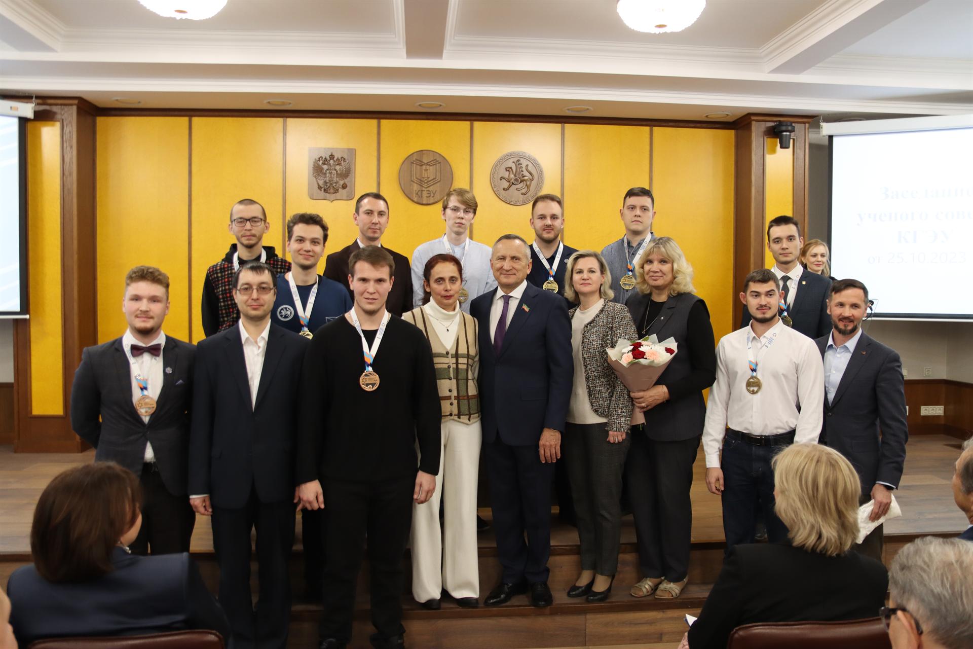 Члены ученого Совета КГЭУ поздравили также Ефима Широбокова за третье место в индивидуальной номинация «Проектирование электротехнической части и систем автоматизации» III Международного строительного чемпионата (научный руководитель - доцент кафедры Электрические станции им. В.К.Шибанова Венера Булатова).