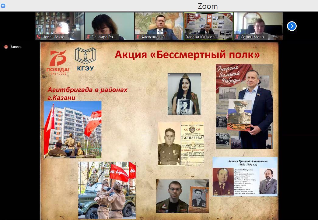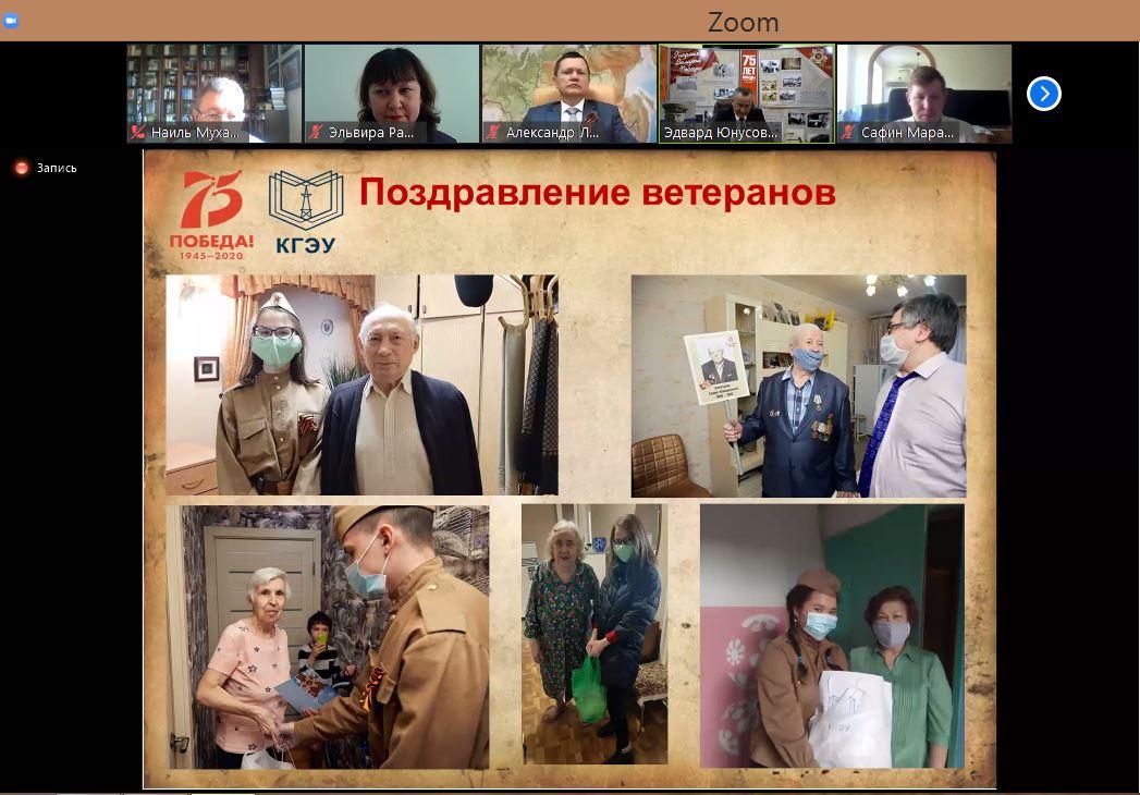 По второй части заседания, до сведения участников заседания ректором доведена информация о мероприятиях, организованных университетом в рамках празднования 75-й годовщины Победы в Великой Отечественной войне 1941-1945 годов, большинство из которых пройдет в дистанционном формате. Так силами творческих коллективов вуза организован праздничный концерт, посвященный Дню Победы, на котором прозвучали военные и патриотические песни и стихи. Видеоролик был показан участникам расширенного заседания Ученого Совета КГЭУ и размещен на официальном сайте КГЭУ. Также в преддверии празднования Великой Победы ректор Эдвард Абдуллазянов вместе с коллегами из профкома университета и студентами-волонтерами поздравили ветеранов энергоуниверситета - тружеников тыла и детей войны. Они получили подарочные наборы, в которые вошли продукты для праздничного стола, а также так необходимые сейчас медицинские маски и антисептики.