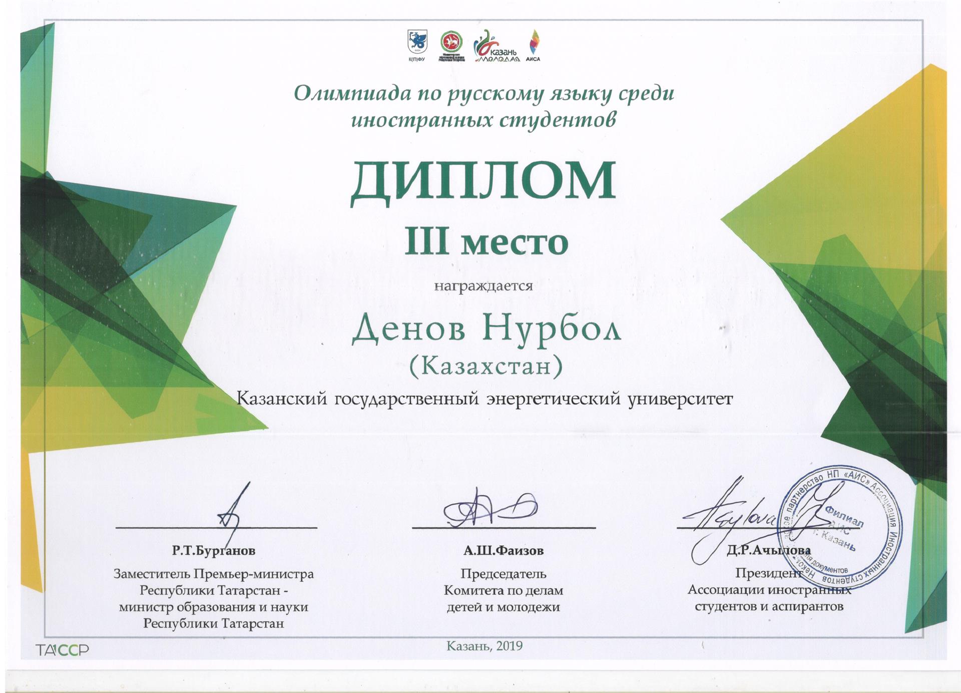 3 место в категории «1,2 курс Ближнее зарубежье, бакалавриат» занял студент 2 курса Института Теплоэнергетики, гражданин Казахстана Денов Нурбол.
