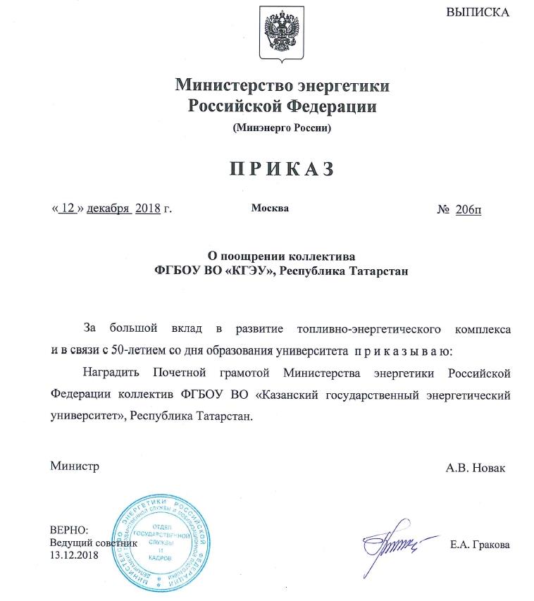 Приказом министра энергетики А.В. Новака коллектив КГЭУ награжден почетной грамотой за большой вклад в развитие топливно-энергетического комплекса и в связи с 50-летием со дня образования университета.