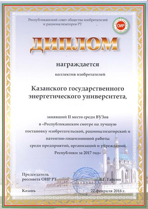 Коллектив изобретателей КГЭУ занял II место среди ВУЗов в «Республиканском смотре на лучшую постановку изобретательской, рационализаторской и патентно-лицензионной работы среди предприятий, организаций и учреждений Республики за 2017 год».