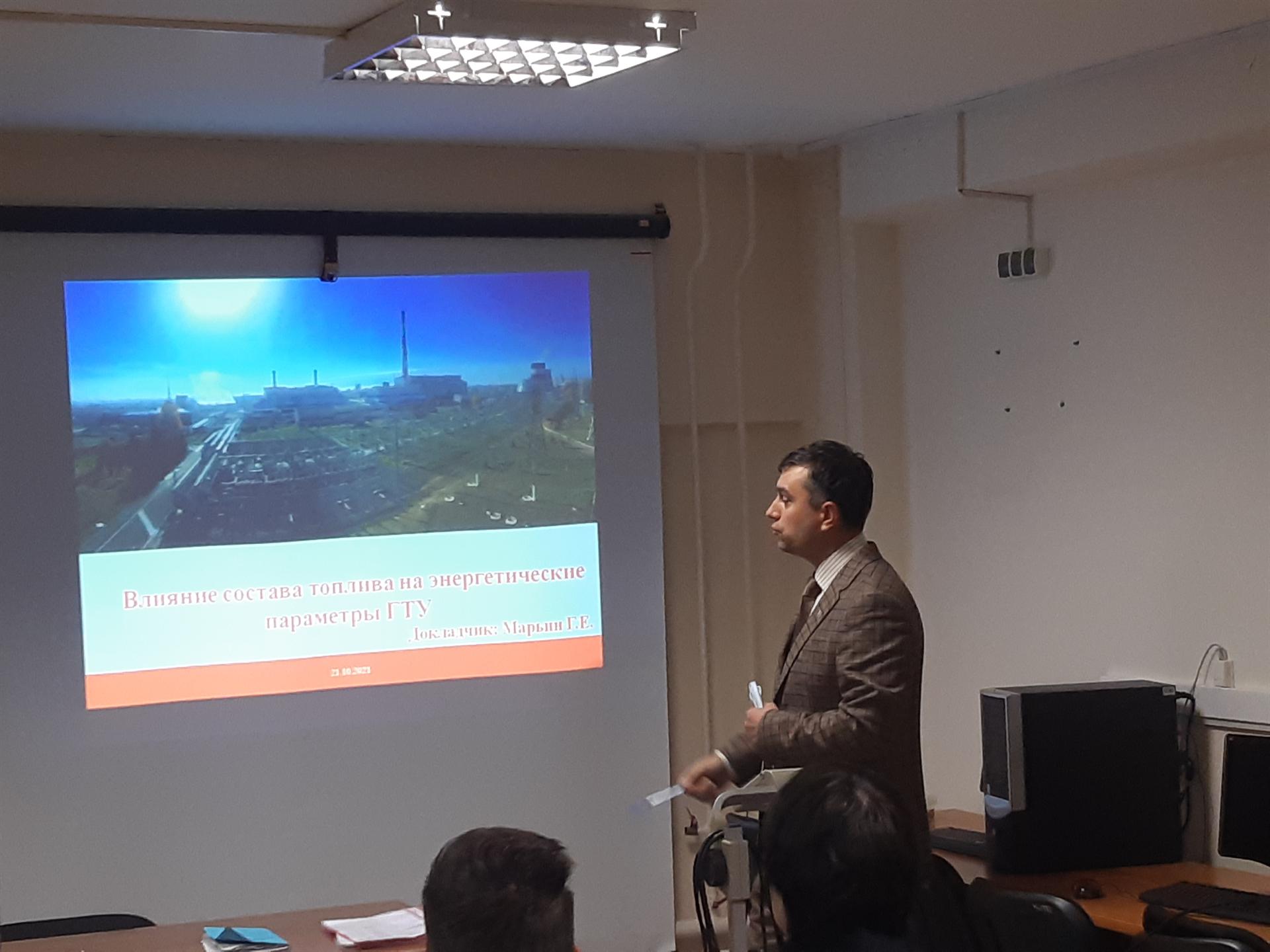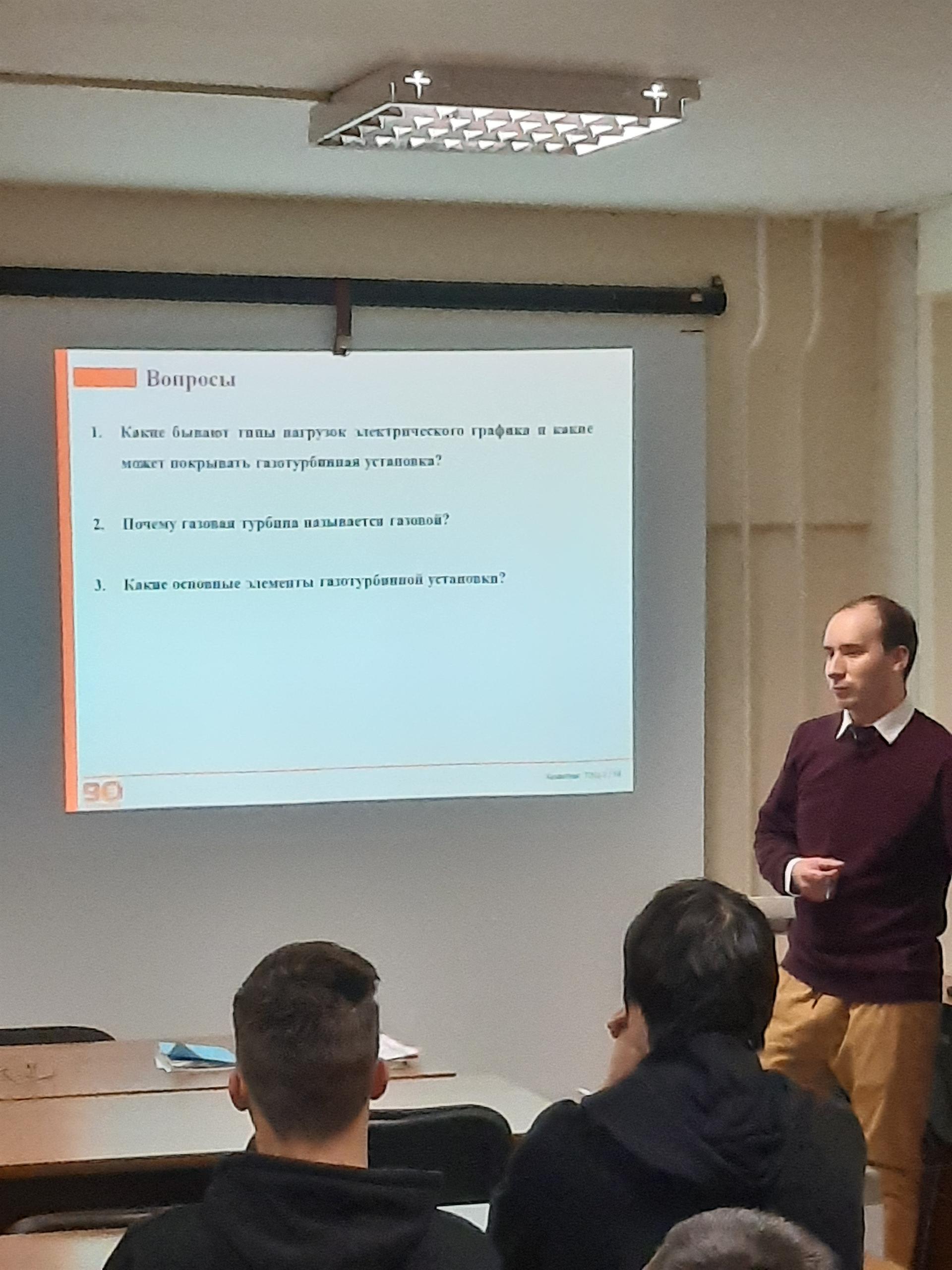 Тема занятий была посвящена парогазовым установкам. Менделеев Дмитрий Иванович - машинист энергоблока 7-го разряда рассказывал о газовых и парогазовых установках и их эксплуатацию, Марьин Георгий Евгеньевич - старший машинист энергоблоков - о влиянии состава топлива на энергетические параметры газотурбинной установки. Следует отметить, что и Марьин, и Менделеев являются выпускниками нашего вуза, а в настоящее время – соискатели кафедры ЭМ.