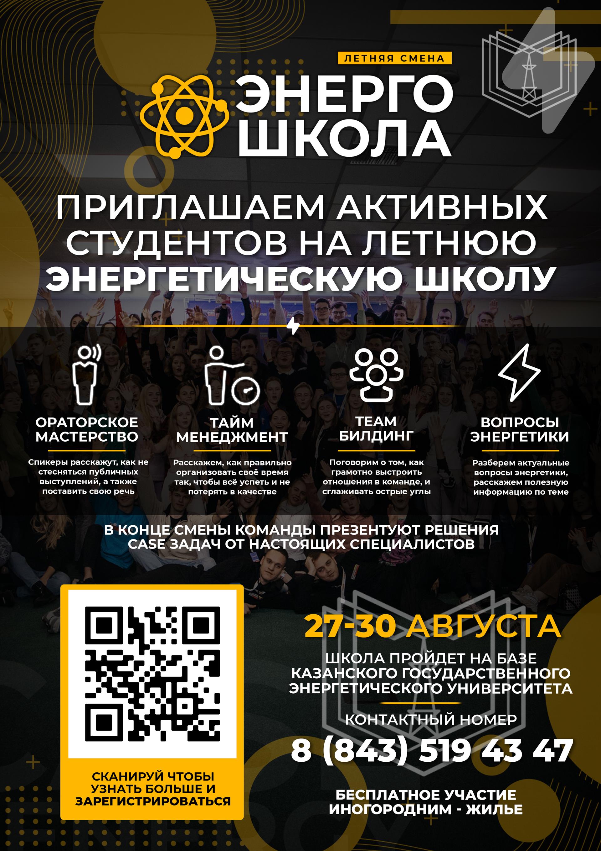 27-30 августа 2022 на базе ФГБОУ ВО "КГЭУ" будет проведена бесплатная Летняя Энергетическая Школа Skill Unity. Организаторами данной школы являются студенты 3-4 курса, которые ранее являлись победителями конкурса “ТвойХод”.