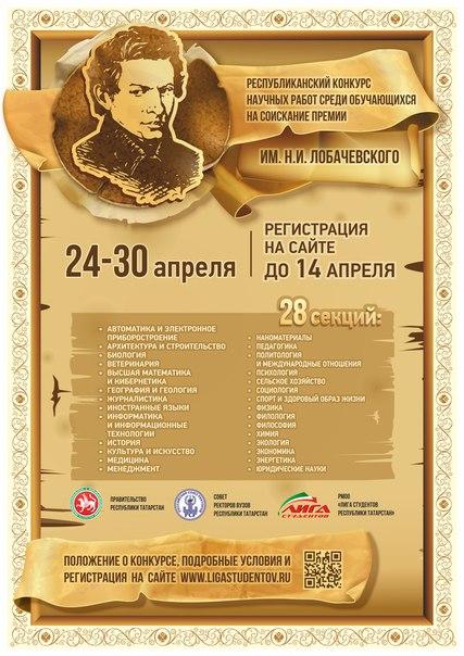 Проводится Республиканский конкурс научных работ среди обучающихся на соискание премии Н.И. Лобачевского. К участию в конкурсе приглашаются студенты и аспиранты.