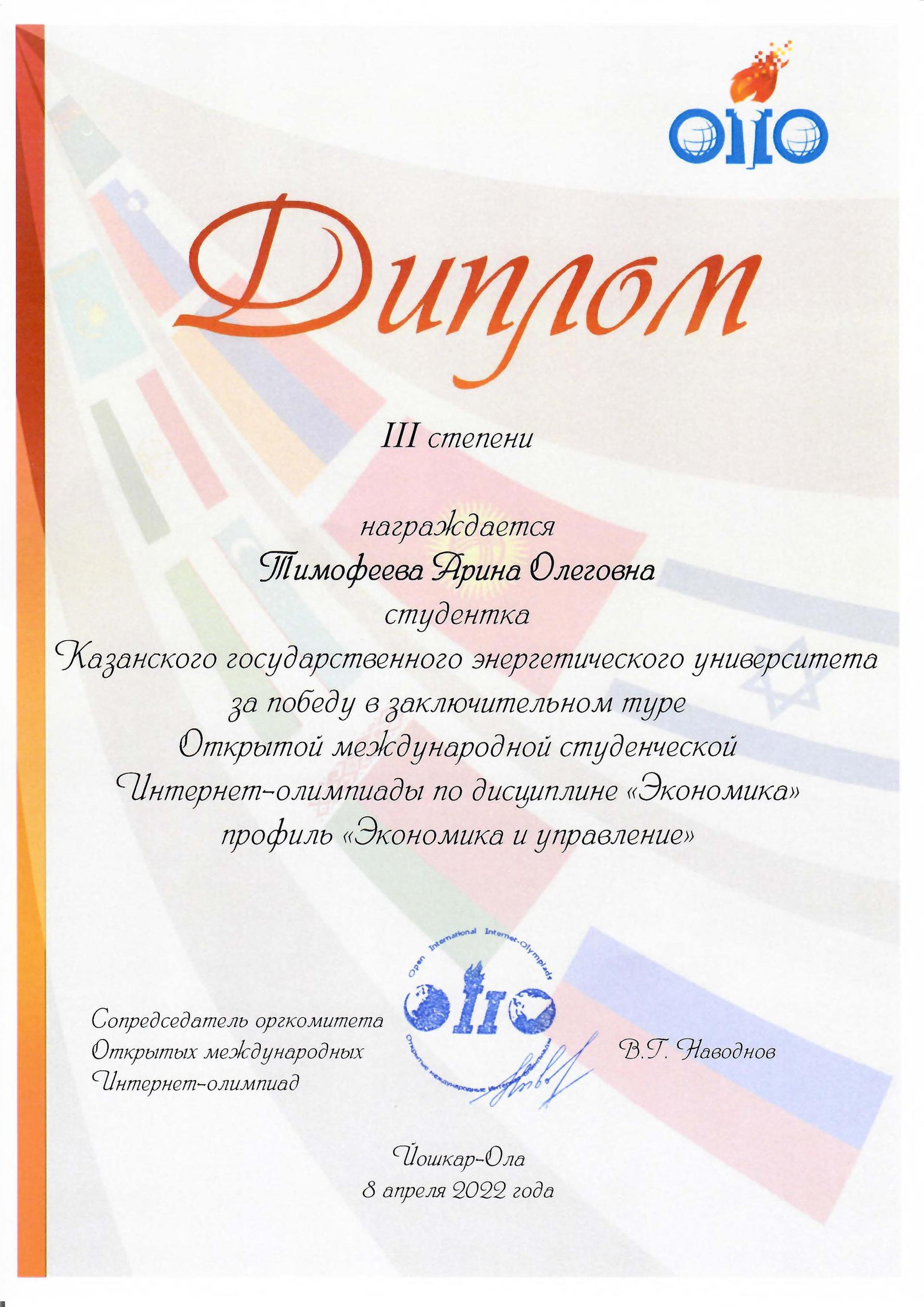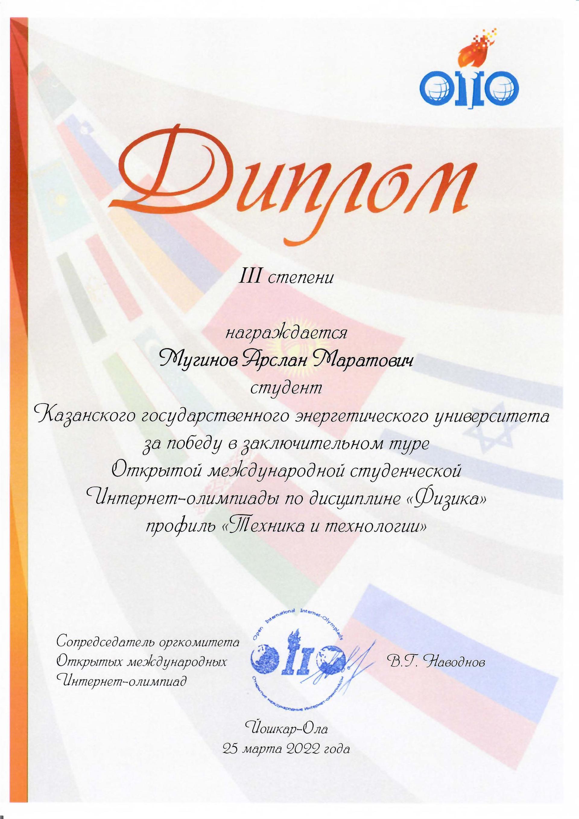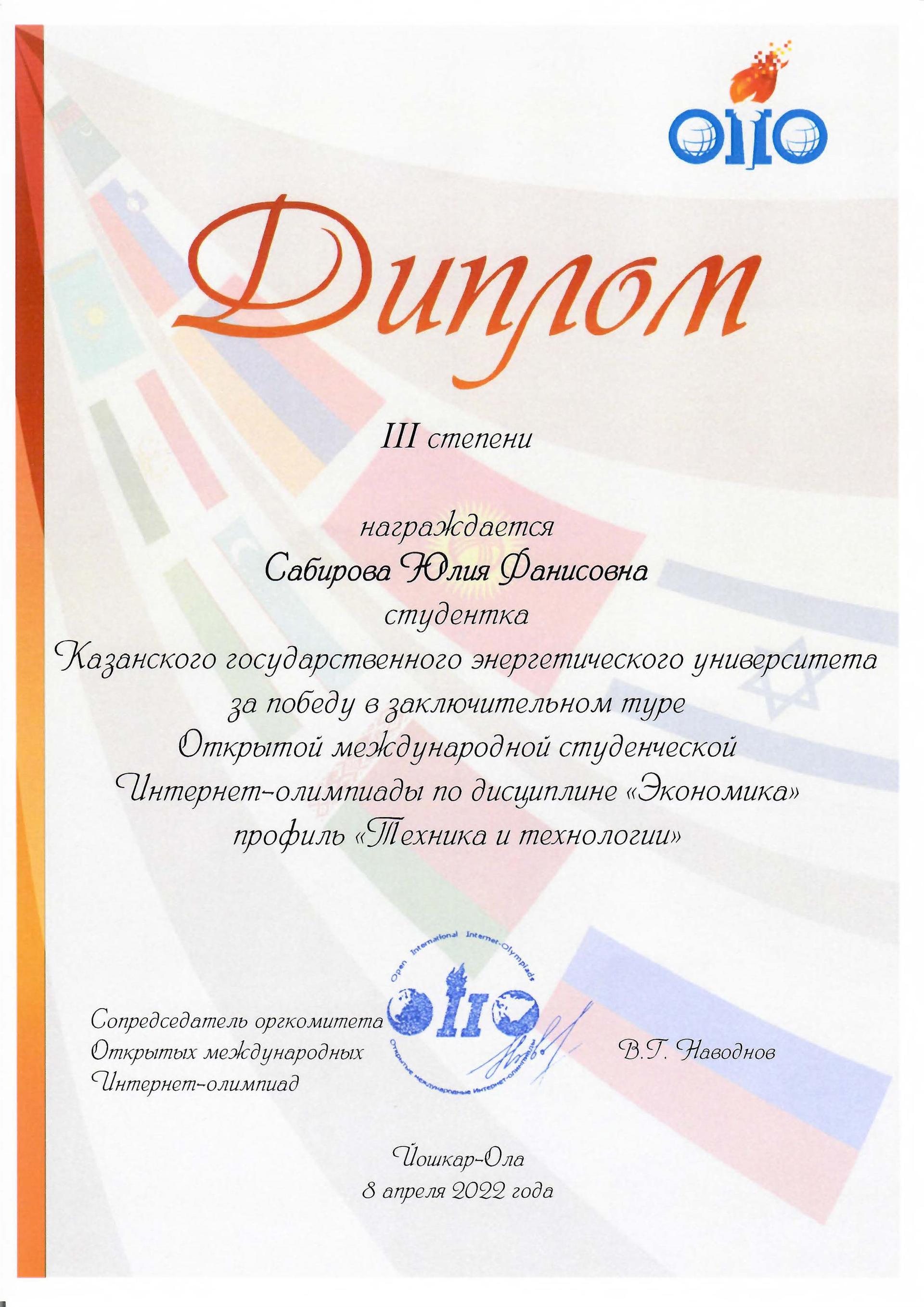 По итогам Открытой международной студенческой Интернет-олимпиады в 2022 году бронзовыми медалями и дипломами III степени награждены следующие студенты: