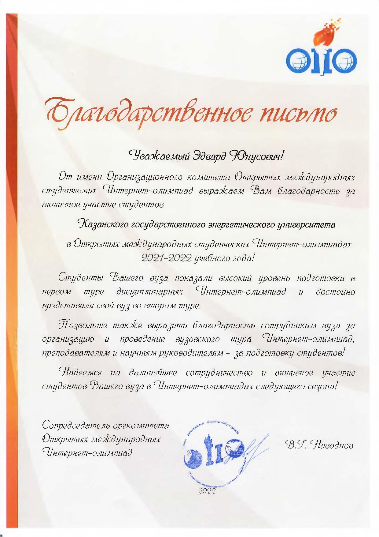 За успешное участие студентов КГЭУ в адрес ректора Эдварда Абдуллазянова поступило Благодарственное письмо, подписанное сопредседателем оргкомитета Открытых международных Интернет-олимпиад Владимиром Наводновым.
