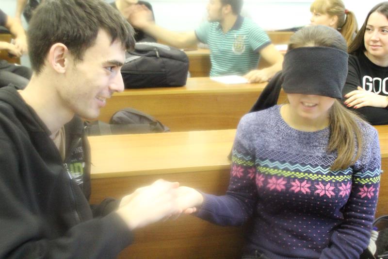 На уроке Доброты студенты просмотрели видеоролик «Со-единение – о фонде». Кроме того, студенты посмотрели видеообращение заместителя министра образования и науки Российской Федерации Каганова В.Ш., «Мир слепоглухих», «Один в темноте» и видеообращение президента фонда «Со-единение» Поликанова Д.В. «Слепоглухие: кто они такие? Как им помочь?». Ознакомились с дактилологией – форма речи посредством пальцев рук. Далее, разбившись на пары, с завязанными глазами, пытались прочитать написанное напарником слово на ладони.
