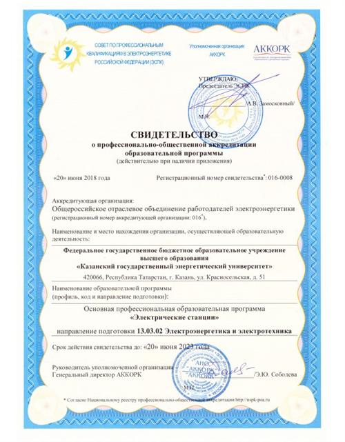 Завершилась сложная, но очень важная для вуза процедура! По итогам внешней экспертизы качества и профессионально-общественной аккредитации, проведенной Общероссийским отраслевым объединением работодателей электроэнергетики (РАЭЛ) совместно с уполномоченной организацией - Агентством по контролю качества образования и развития карьеры (АККОРК), в июне 2018 года решением Совета по профессиональным квалификациям в электроэнергетике Российской Федерации аккредитована образовательная программа бакалавриата «Электрические станции» по направлению подготовки 13.03.02 «Электроэнергетика и электротехника», реализуемая выпускающей кафедрой «Электрические станции им. В.К. Шибанова».