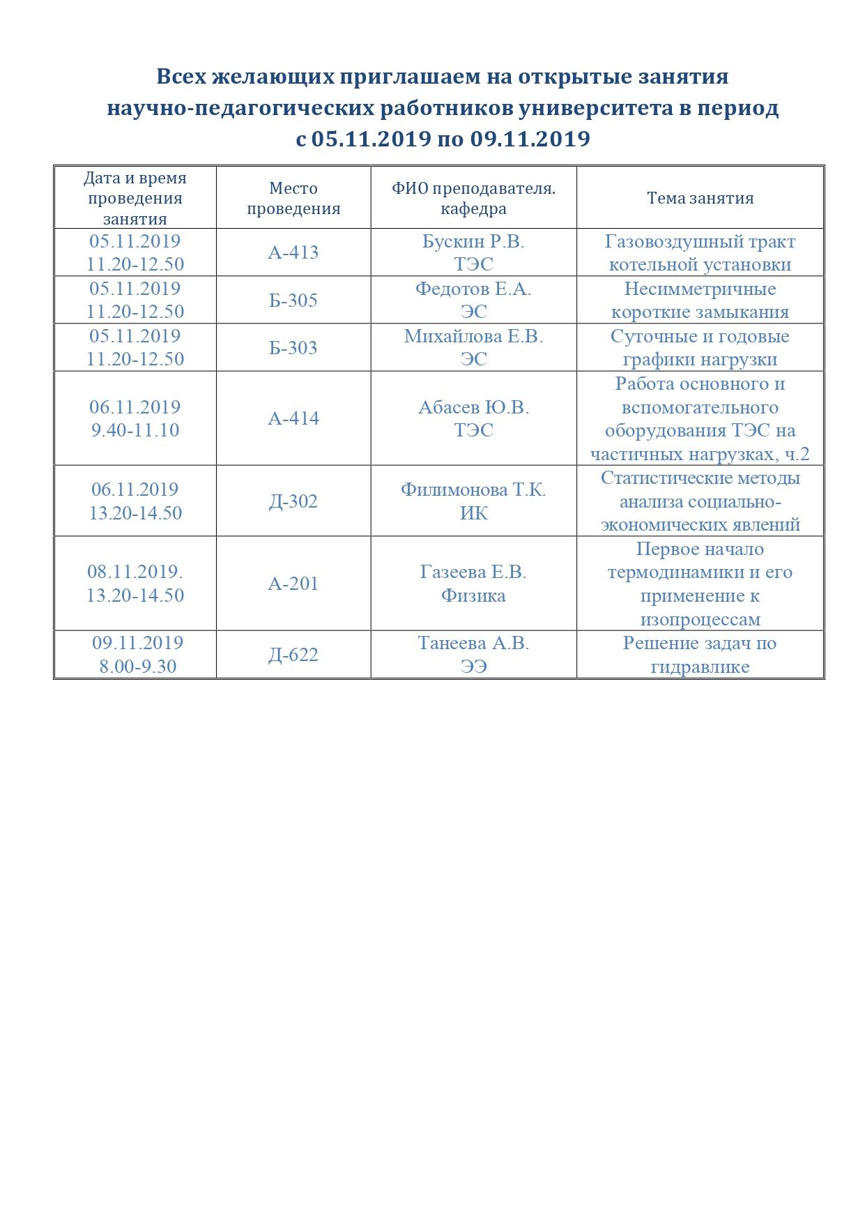 Расписание открытых занятий с 5 по 9 ноября.
