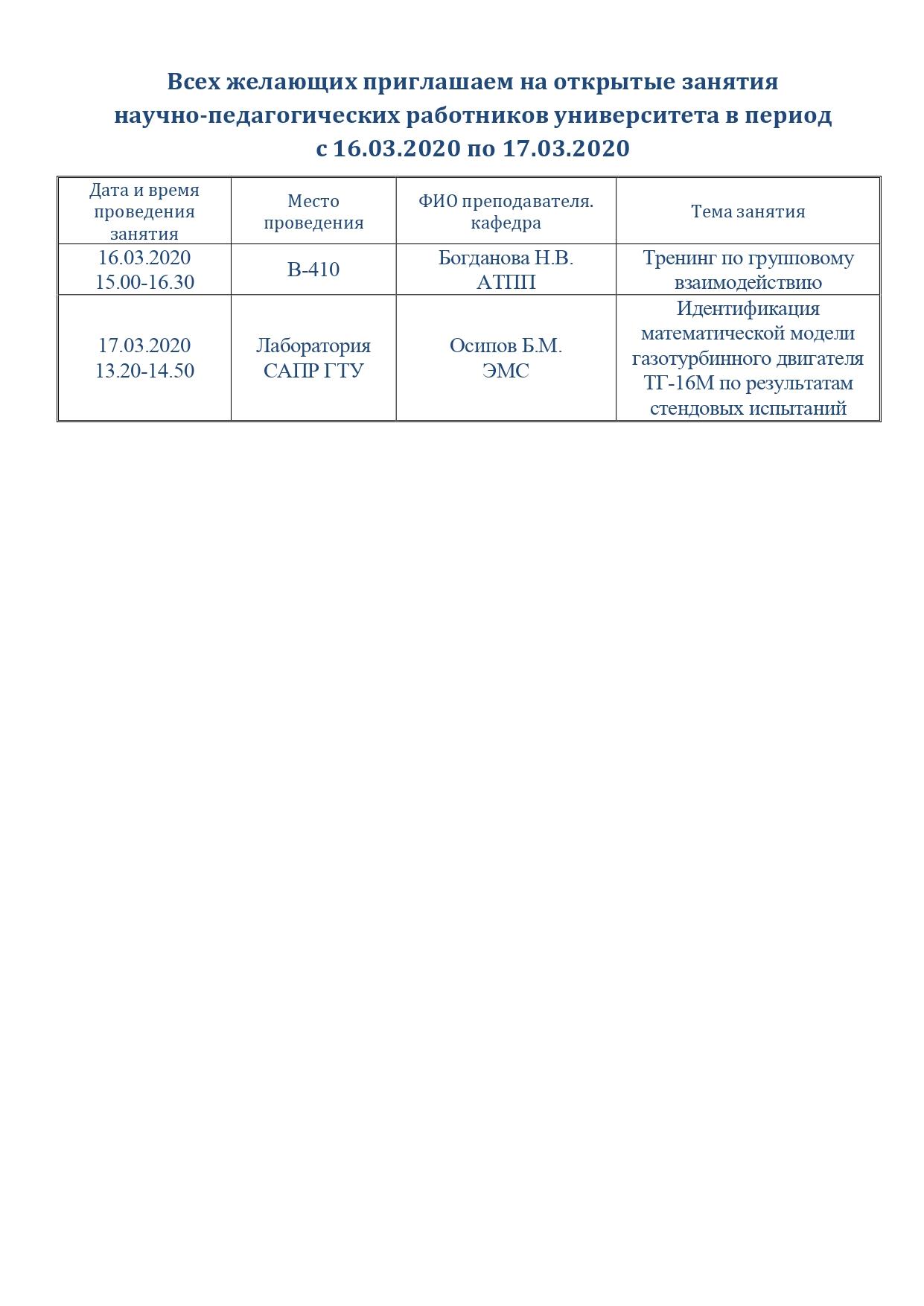 Расписание открытых занятий с 16 по 17 марта 2020г.