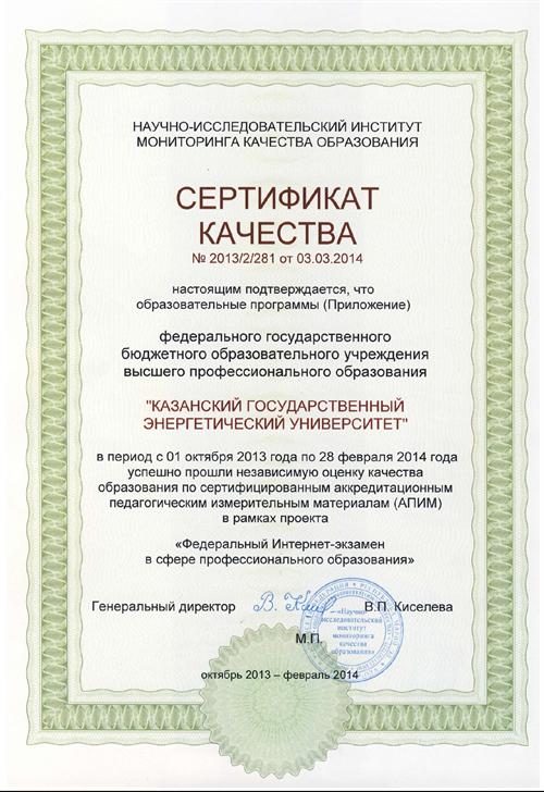 В период с 1 октября 2013 года по 28 февраля 2014 года десять образовательных программ нашего университета успешно прошли независимую оценку качества образования по сертифицированным аккредитационным педагогическим измерительным материалам (АПИМ) в рамках проекта «Федеральный Интернет-экзамен в сфере профессионального образования» и получили СЕРТИФИКАТ КАЧЕСТВА.