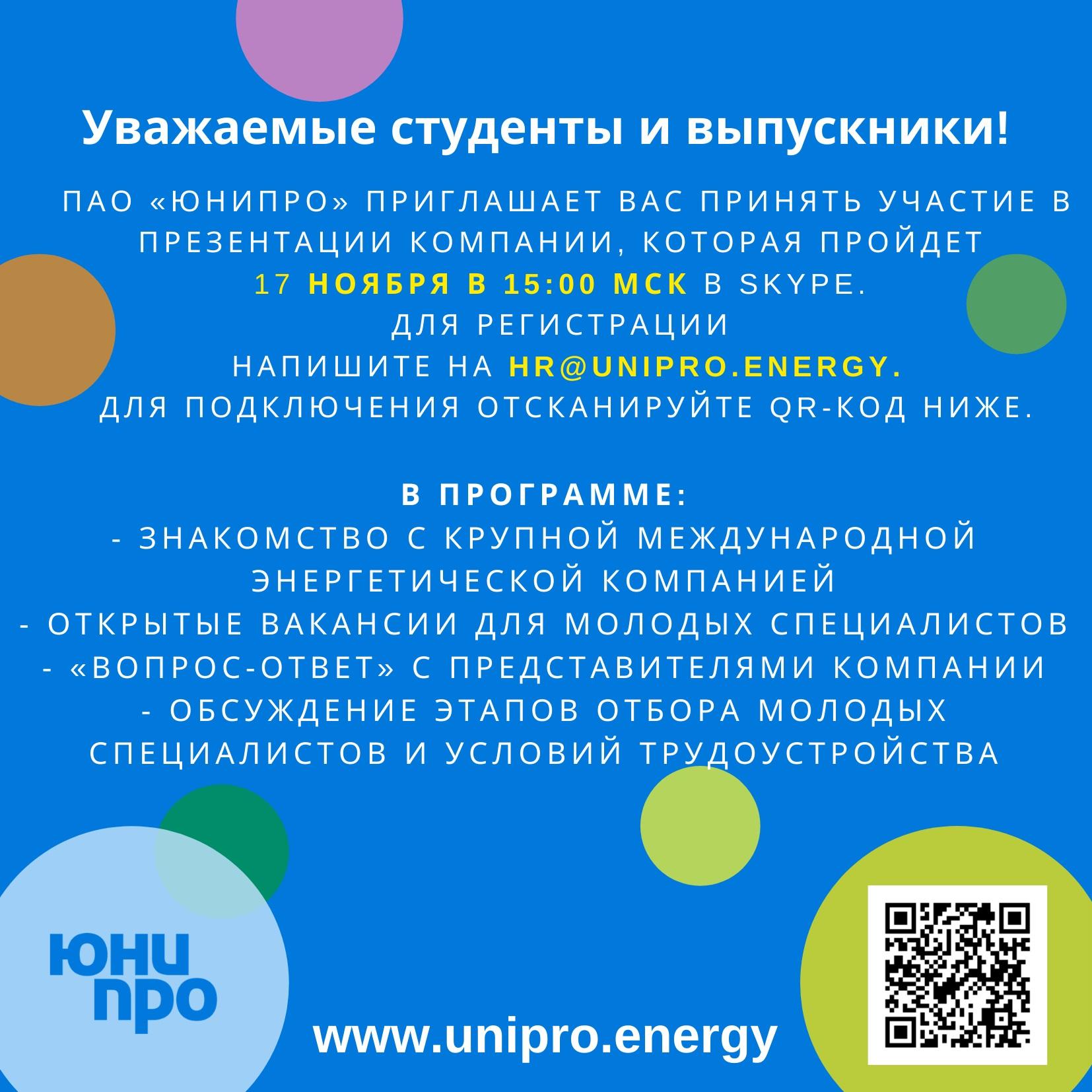 17 ноября в Skype пройдет презентация энергетической компании ПАО "ЮНИПРО" для студентов и выпускников КГЭУ.